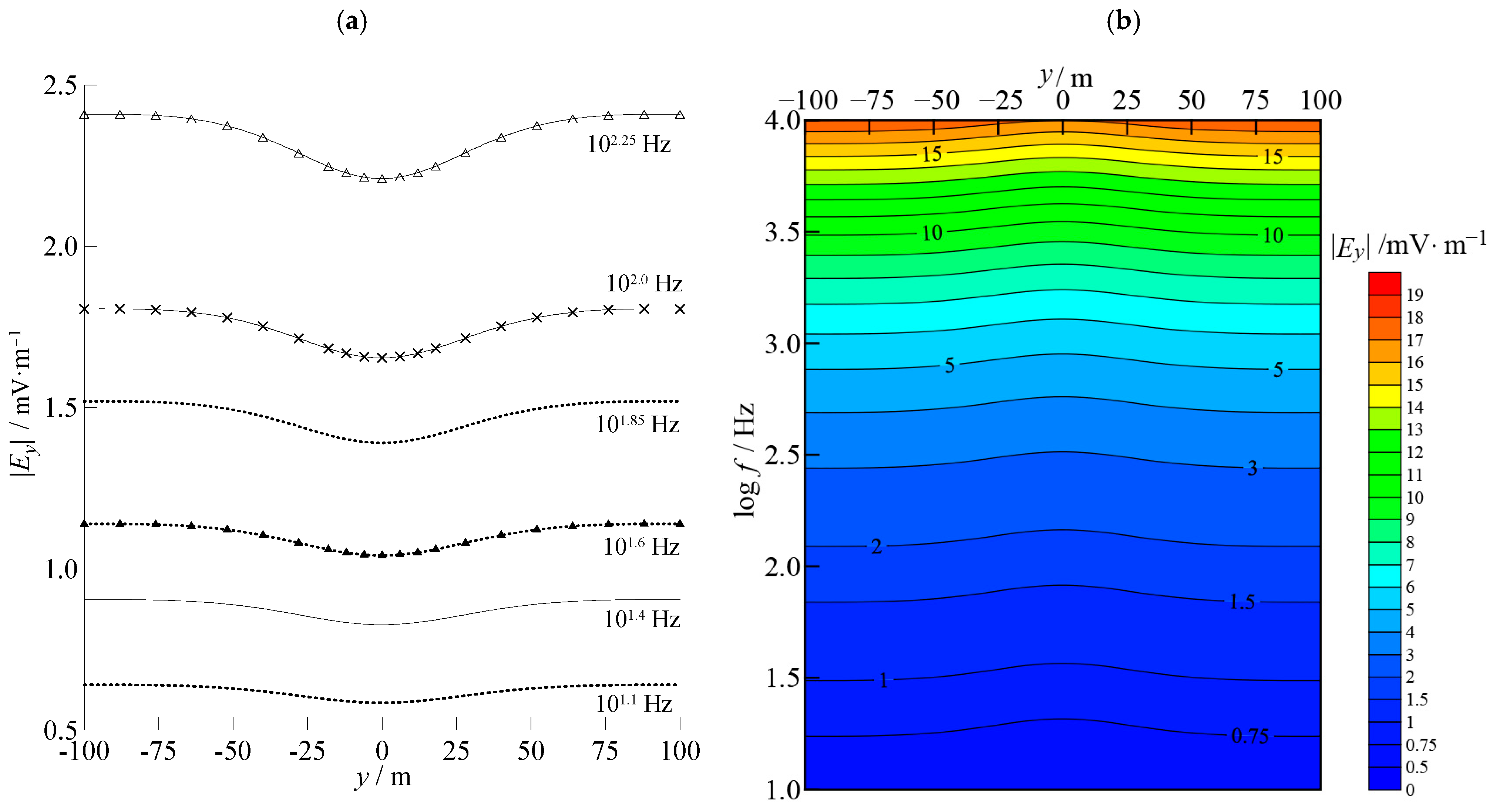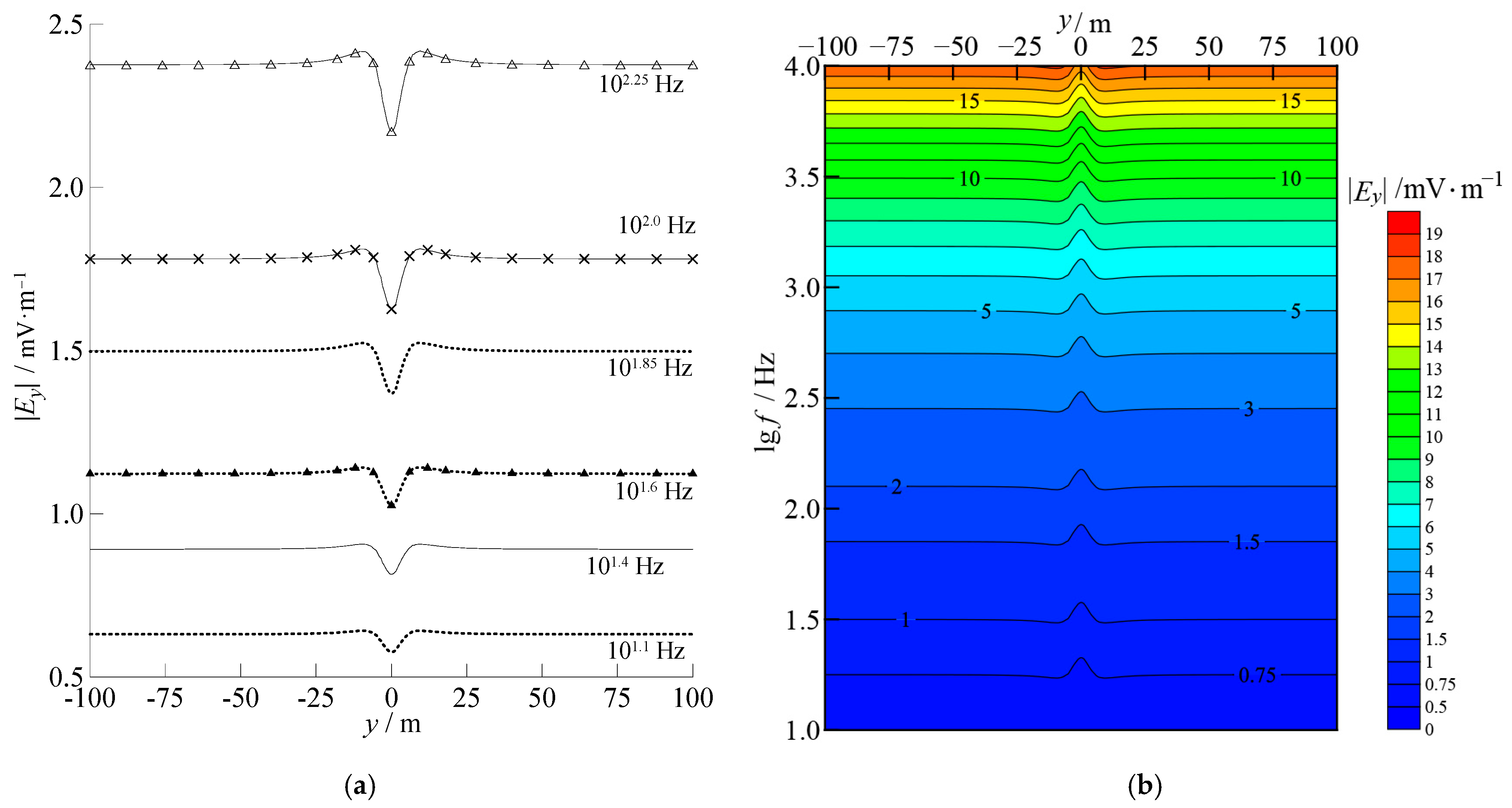 Figure 2. (a) Modulus curves of Ey for the galvanic distortion model. (b) Pseudo-section of the modulus of Ey for the galvanic distortion model.