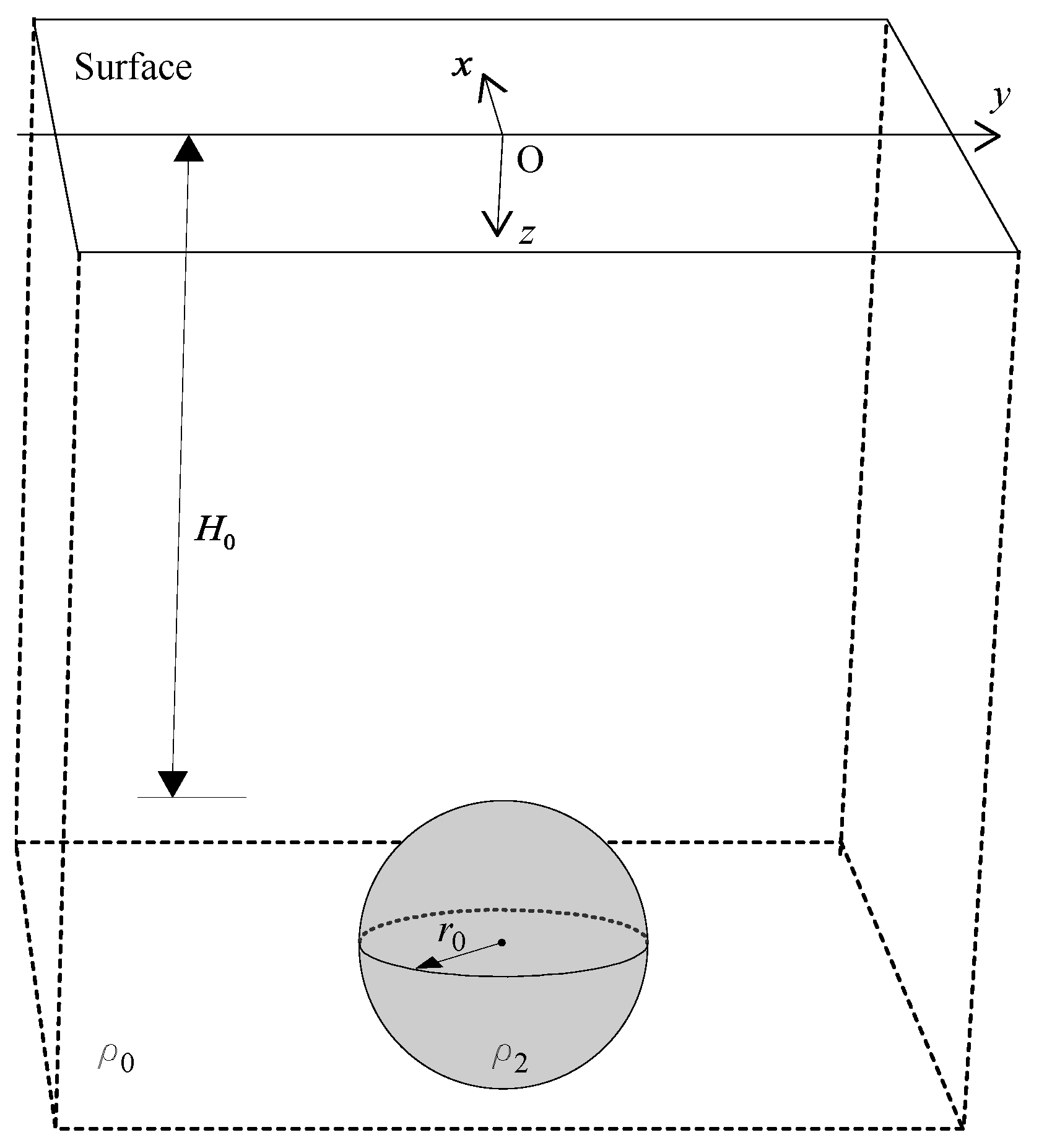 The spherical anomaly model is shown in Figure 3. The background resistivity ρ 0 is 1000 Ω·m. A spherical anomalous body with resistivity ρ 2 = 1 Ω·m is buried at a top depth of 50 m and has a radius of 25 m.