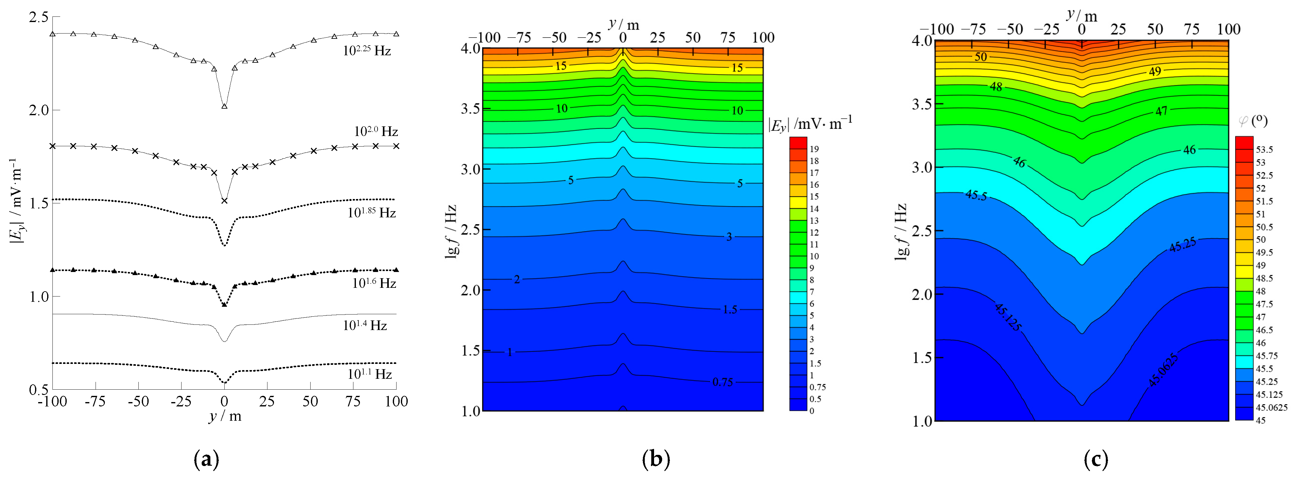 Figure 6. (a) Modulus curves of Ey for the sphere model with galvanic distortion. (b) Pseudo-section of the modulus of Ey. (c) Pseudo-section of the phase of Ey.