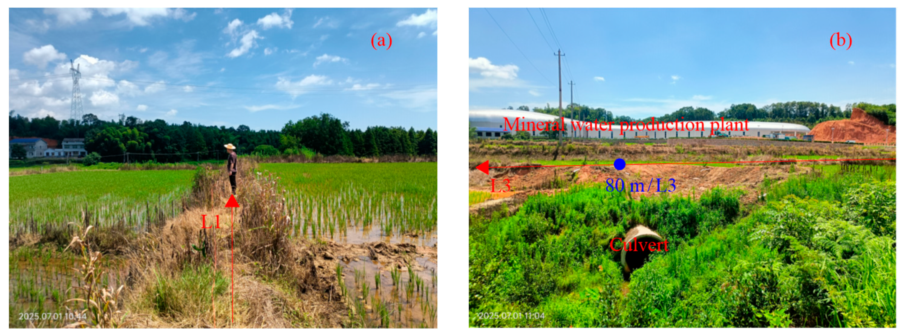 Figure 8. Field photographs of the study area. (a) In situ layout of L1; (b) In situ layout of L3.