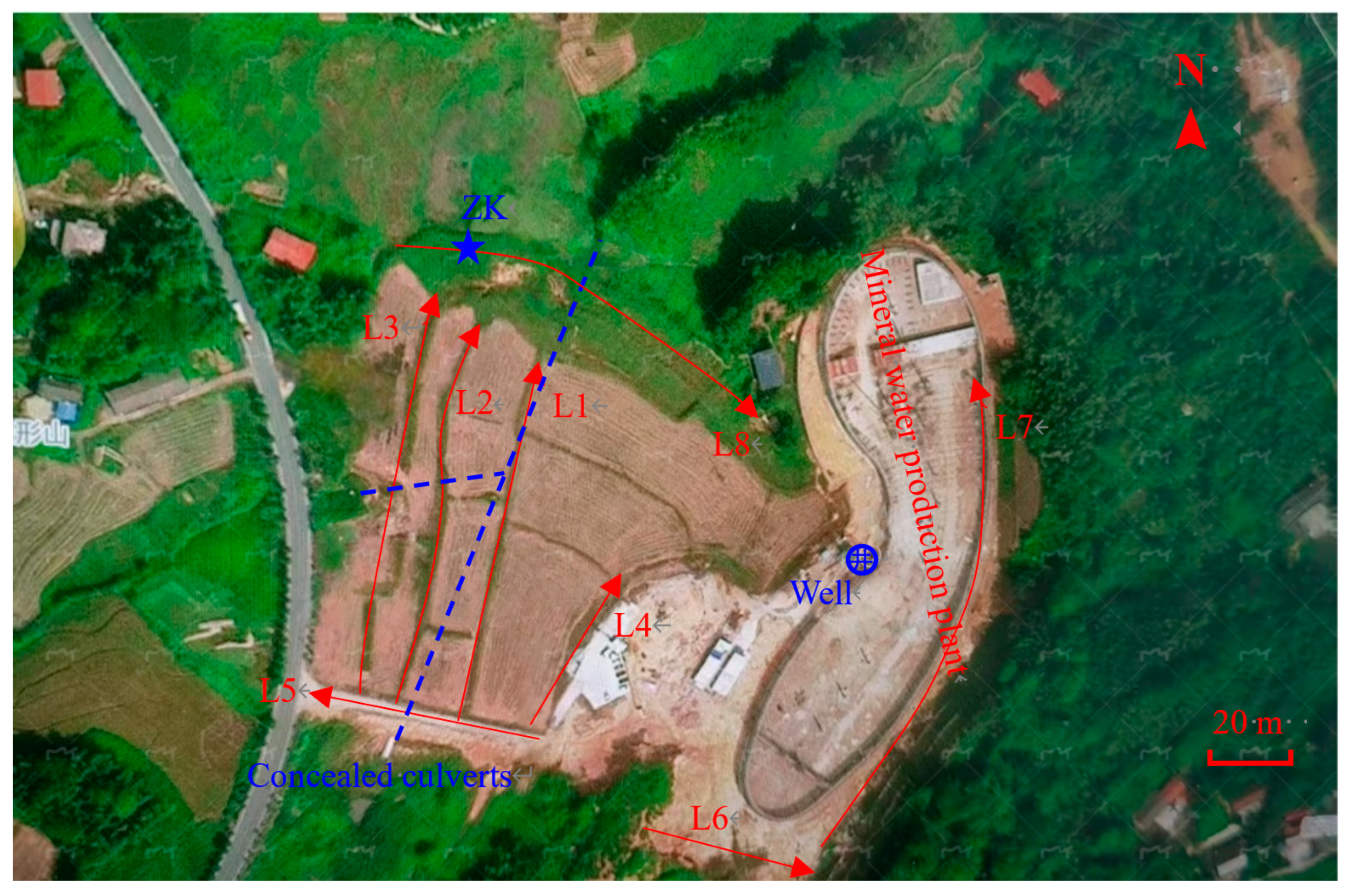 The study area lies within hilly terrain characterized by dense vegetation and agricultural land. Additionally, the region contains power transmission lines, concealed culverts, a mineral water production plant, and residential buildings, as shown in Figure 8, where L1 and L3 denote the geophysical survey line numbers.