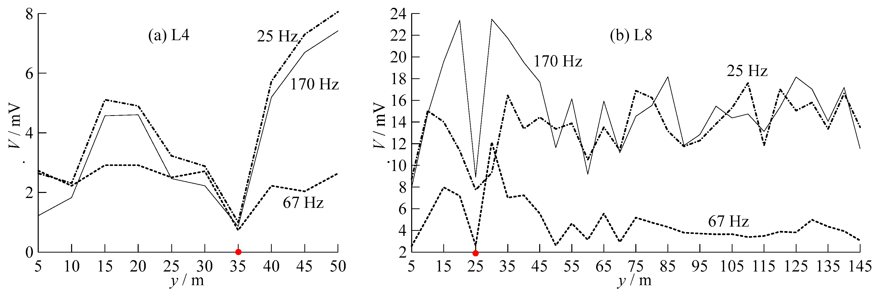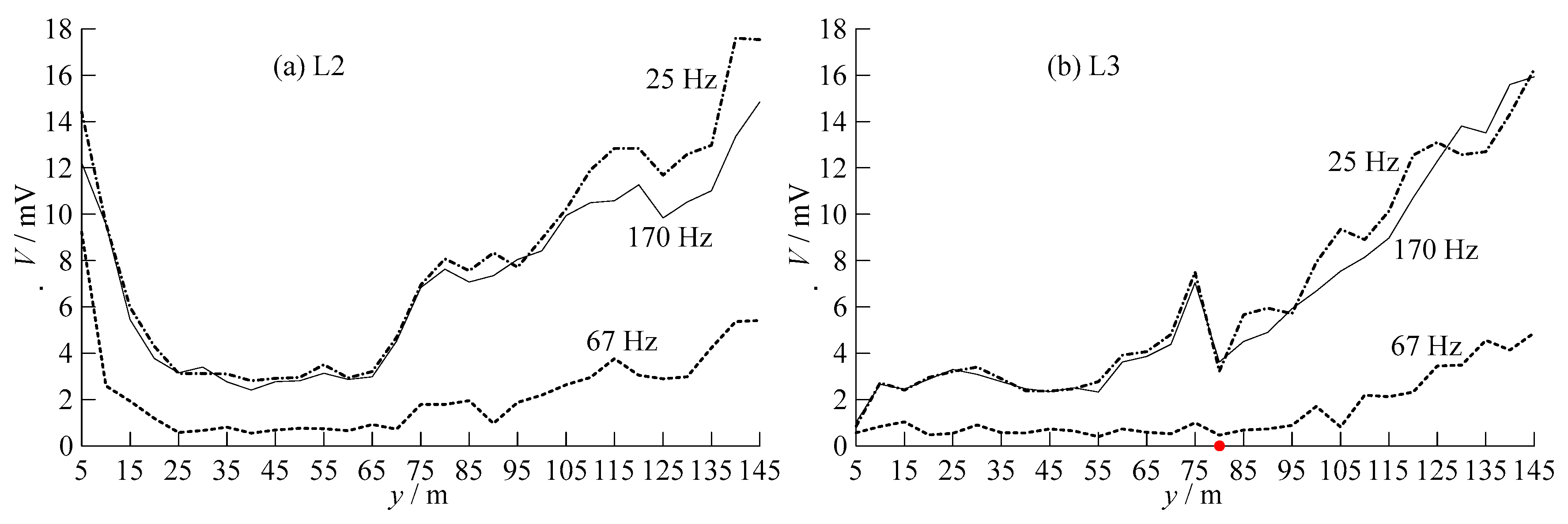 Figure 10 presents the triple-frequency exploration results along survey lines L2 and L3. Solid, dashed, and dotted lines represent data collected at 170 Hz, 67 Hz, and 25 Hz, respectively. Both profiles exhibit a clear upward trend at their tail, attributable to a high-voltage transmission line located approximately 600 m ahead of the lines and oriented nearly orthogonal to them (Figure 8a). Additional 220 V power lines cross the survey lines near 90 m/L2 and 85 m/L3 (Figure 8b).