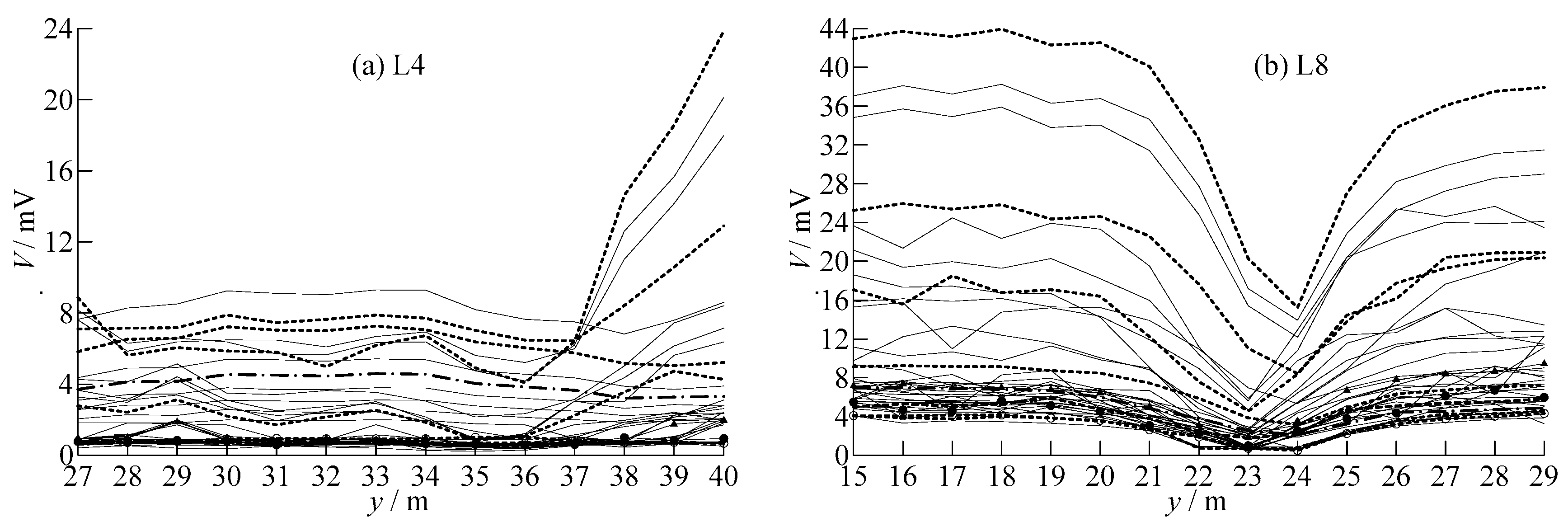 Figure 12. Potential difference ΔV profile curves recorded at 40 frequencies along L4 and L8.