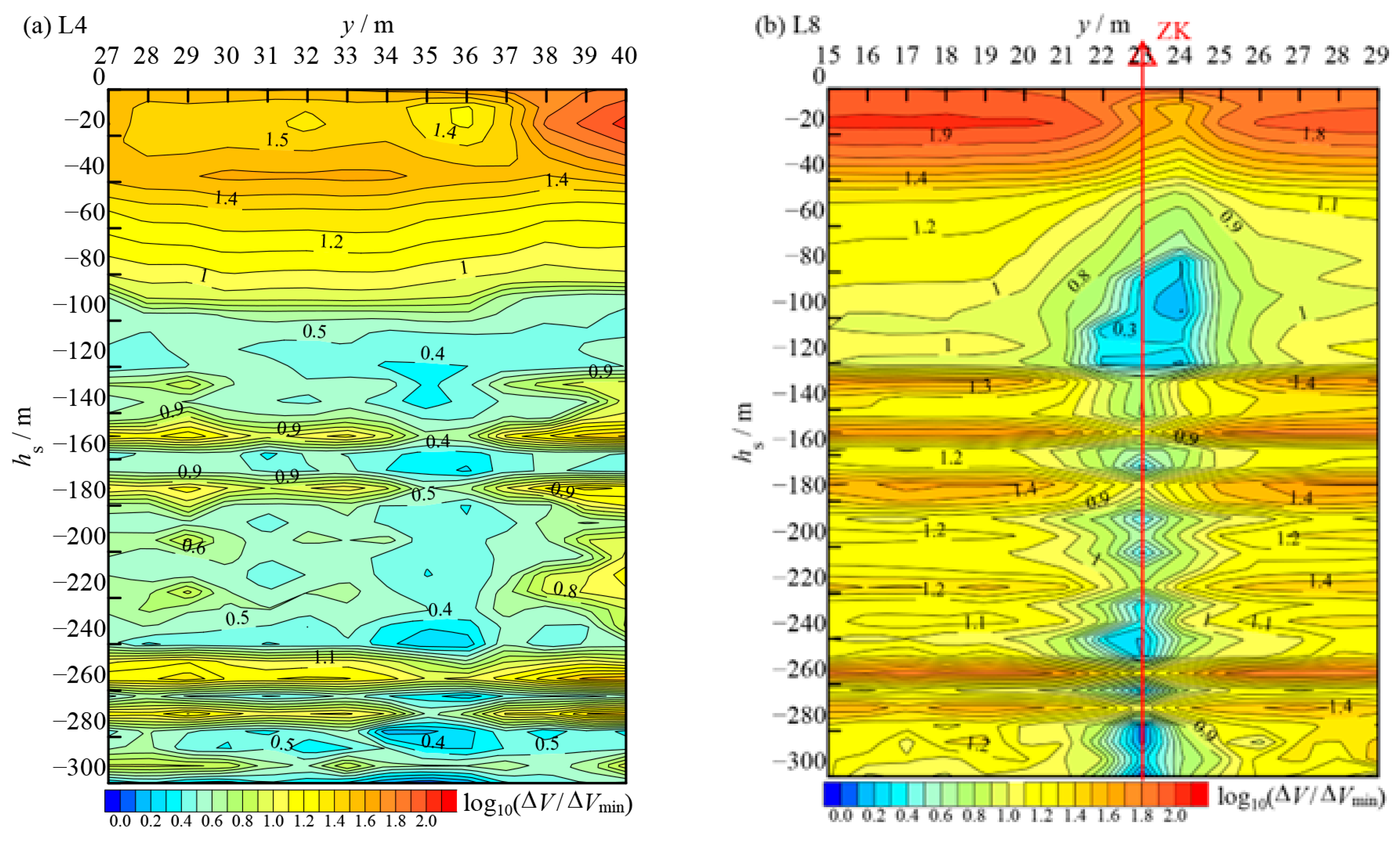 Figure 13 displays the ΔV pseudo-sections for lines L4 and L8. At approximately 100–300 m burial depth on 34–36 m/L4, a relatively low-potential zone is present, exhibiting a “hanging noodles” pattern (Figure 13a). However, the magnitude contrast between this anomaly and adjacent contour lines is modest, and the low-value contours show evident lateral continuity. This suggests that the response on line L4 may have been influenced by the shallow, loosely compacted soil layer, particularly since survey lines L1–L5 lie within the filled area by construction activities of the mineral water plant. This discrepancy arose because the mineral water company failed to inform the survey team in advance about on-site filling activities—information later confirmed by the author through field investigations and comparisons of historical and recent satellite imagery.