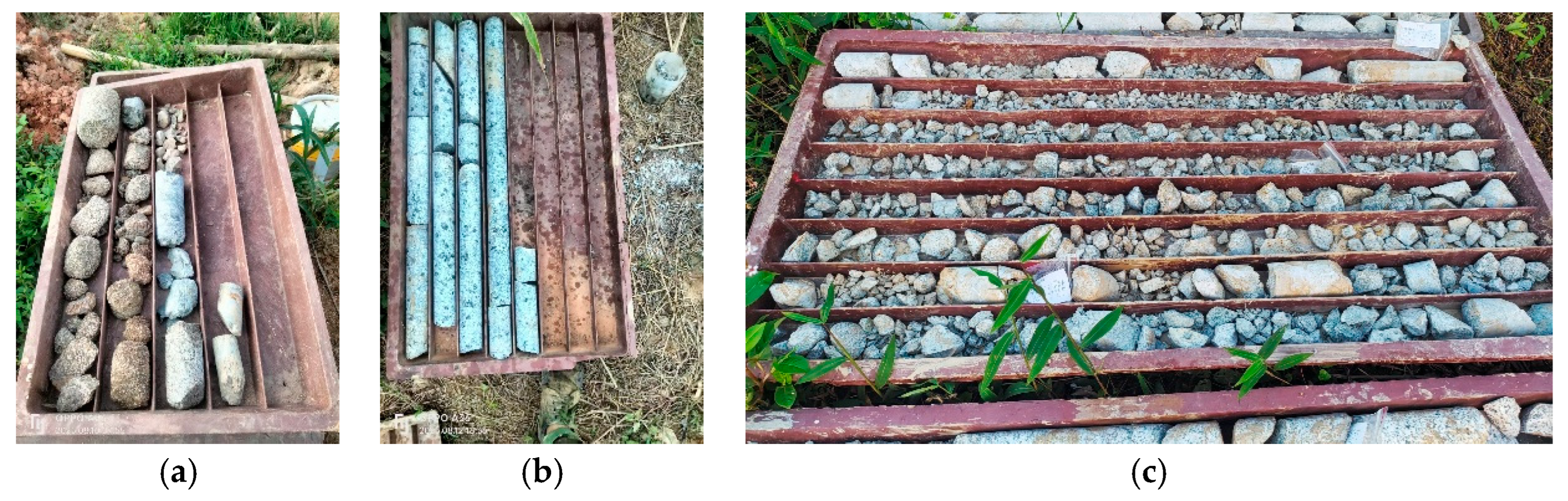 The final drilling depth of well ZK reached 309 m. From 0 to 61.2 m depth, the strata consisted of Quaternary sandy clay overburden; from 61.2 to 63.5 m, strongly weathered granite (Figure 14a); from 252.6 to 262.0 m, a distinct fractured zone (Figure 14c); and the remainder comprised relatively intact granite (Figure 14b). The well achieved a water yield of approximately 340 t/day.