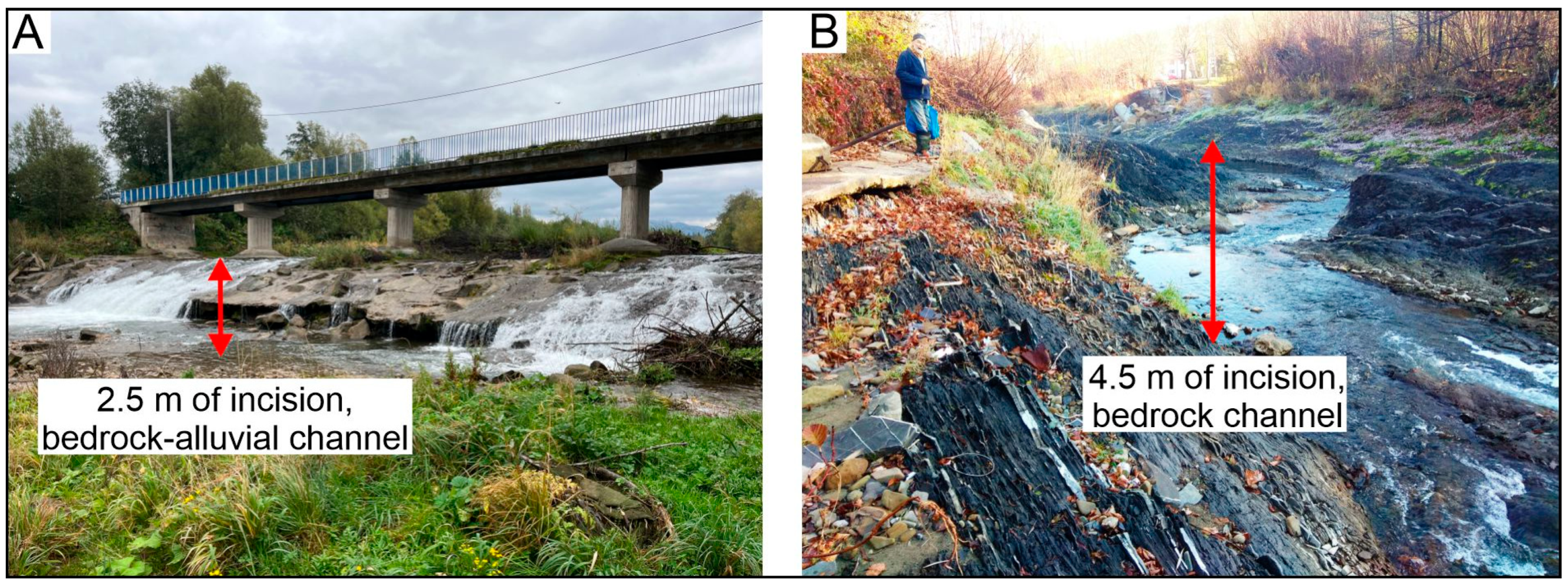Figure 1. Effects of rapid channel incision of rivers in Southern Poland illustrated on the Czarny Dunajec river (A) and Krzyworzeka Stream (B).