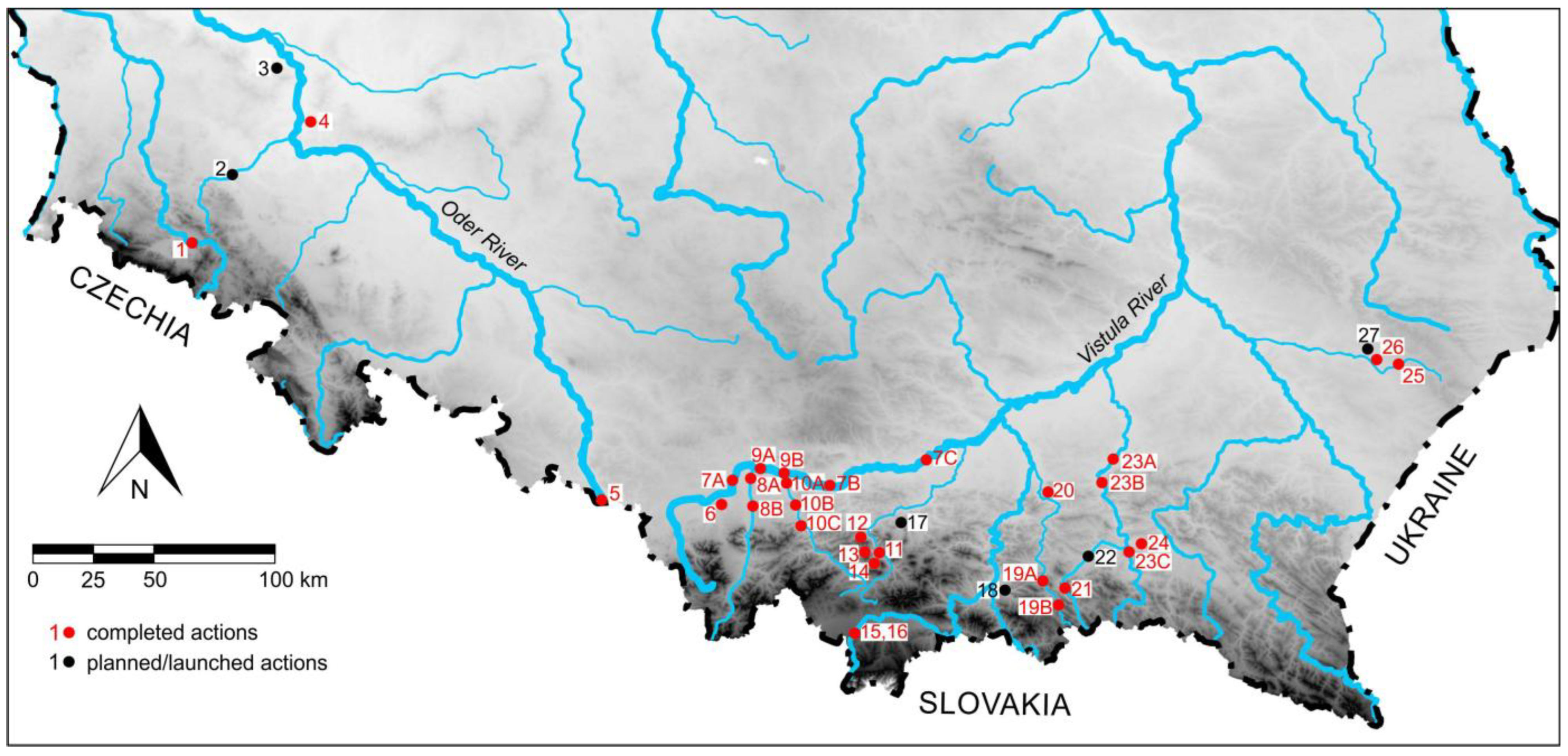 Restoration of the stream longitudinal continuity by neutralizing weirs and steps along the entire length of the river is currently taking place on the Kamienica Nawojowska and Sękówka streams (Figure 2, numbers 18, 22). It was also planned for the Kaczawa river (Figure 2, number 2), but no implementation plans have been made yet.
