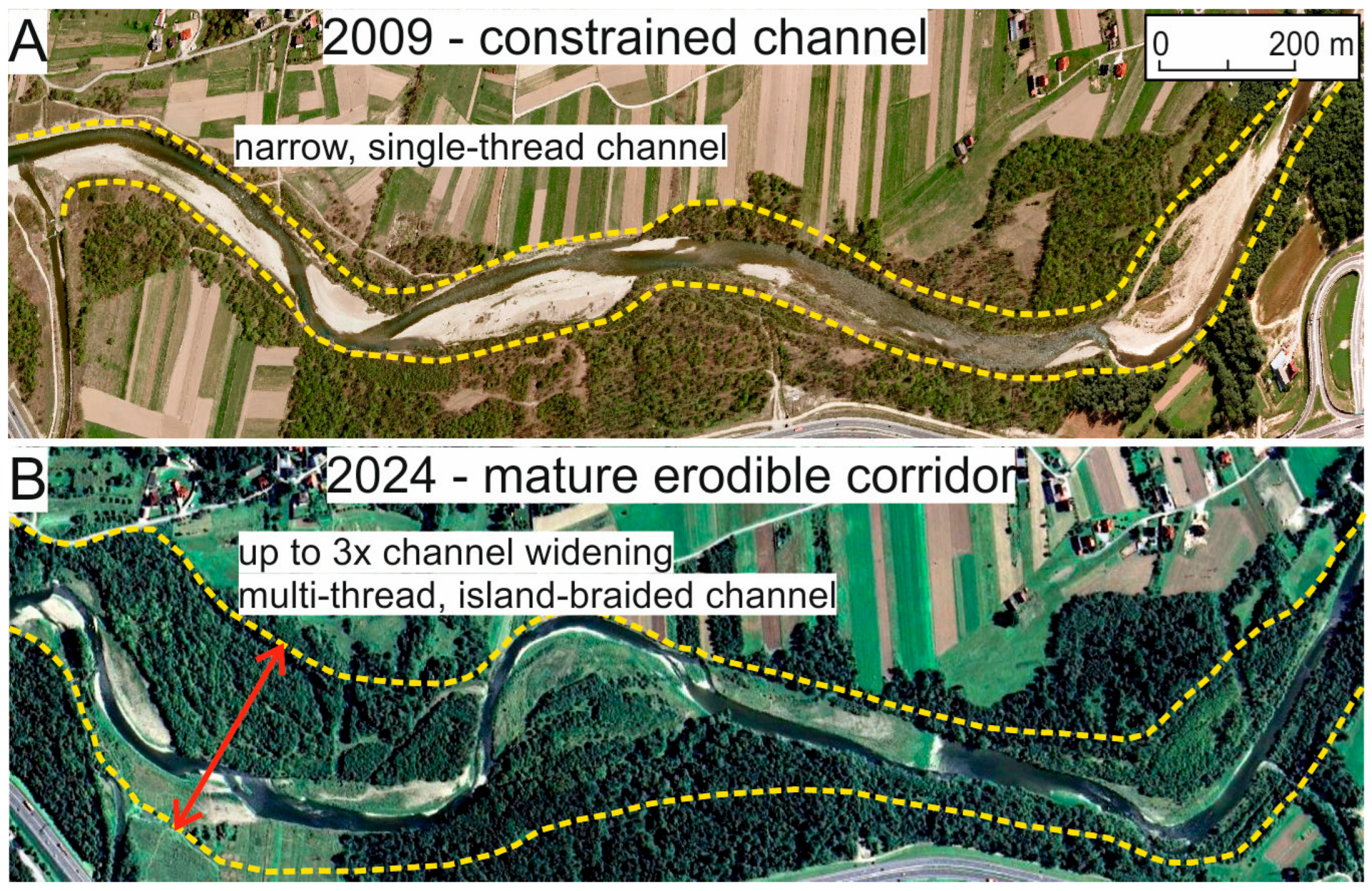 Figure 4. Selected geomorphological changes betweenbefore establishing the erodible corridor (A) and inside a mature erodible corridor of the Raba river (B).