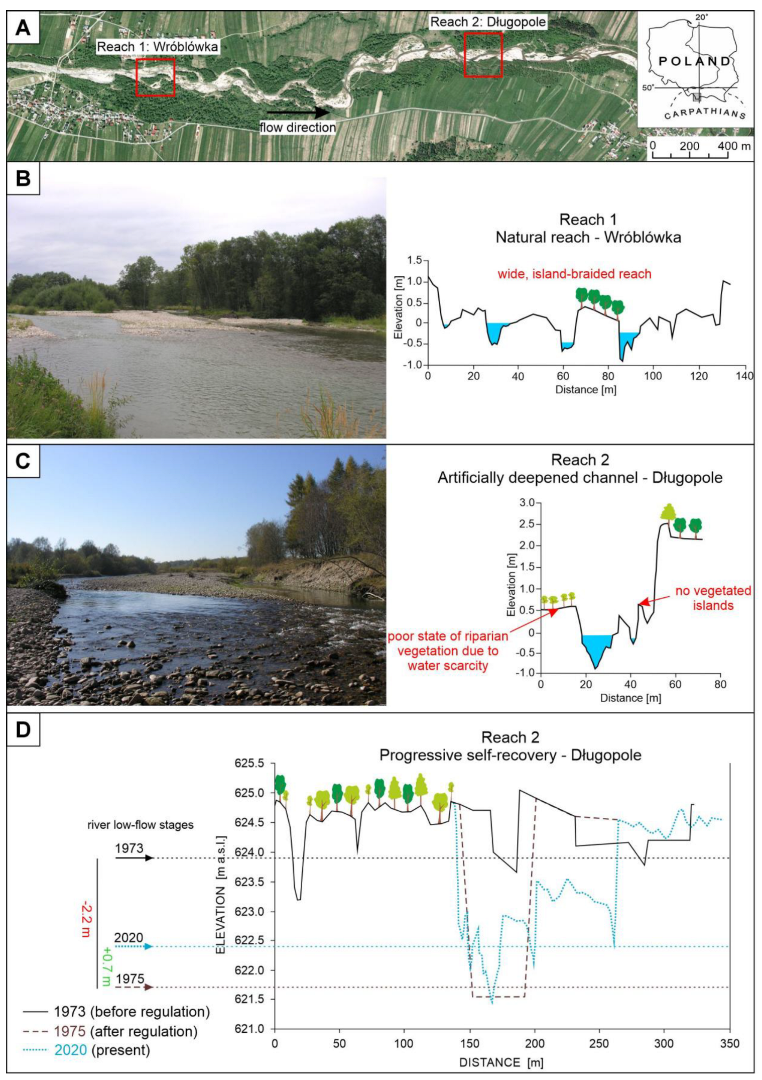 Figure 5. Effects of artificial channel deepening and spontaneous channel restoration in the section of the Czarny Dunajec river experienced by regulation works. (A)—Location of the compared river sections on the orthophoto; (B)—view and cross-section through the natural, island-braided reach; (C)—view and cross-section through the artificially deepened reach; (D)—self-restoration mechanism in the artificially deepened reach.