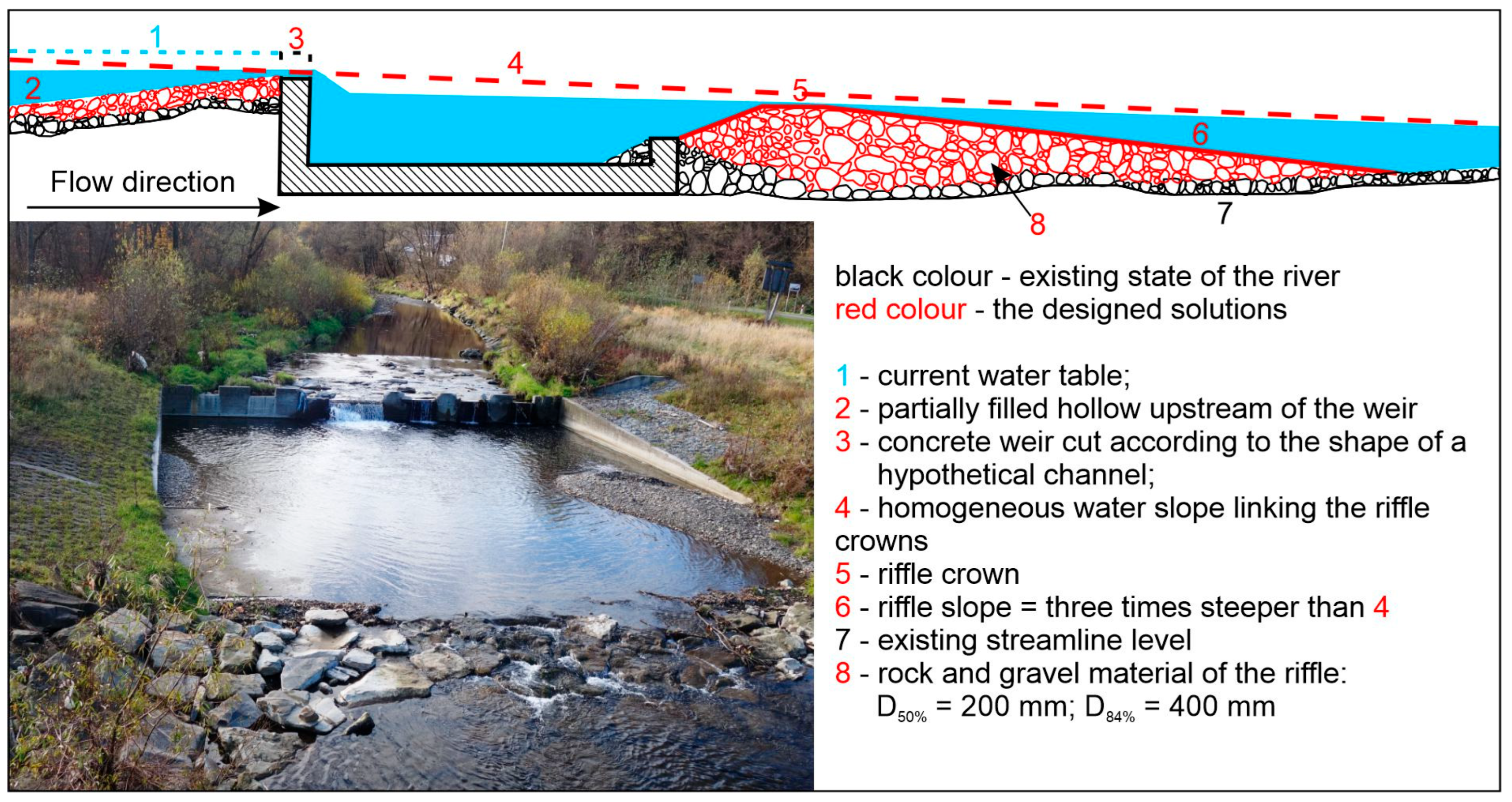 Figure 6. Application of artificial riffles designed to mitigate the harmful impact of old concrete weirs on the Krzyworzeka Stream.