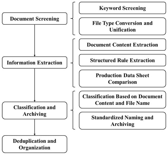 To ensure the validity and relevance of the research data, we designed and implemented a systematic four-level screening strategy: The following procedures are to be followed: first, files are to be screened; second, information is to be extracted; third, the files are to be classified and archived; fourth, deduplication and consolidation are to be carried out. This process extracts high-quality target documents from vast and disorganized raw data. The specific steps involved are illustrated in Figure 2.