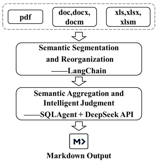 To achieve structured and standardized processing of fracturing documents, we developed an intelligent standardized processing workflow for multiple document types. This workflow was based on the Langchain framework and the DeepSeek API large language model. The overall technical pathway is illustrated in Figure 3.