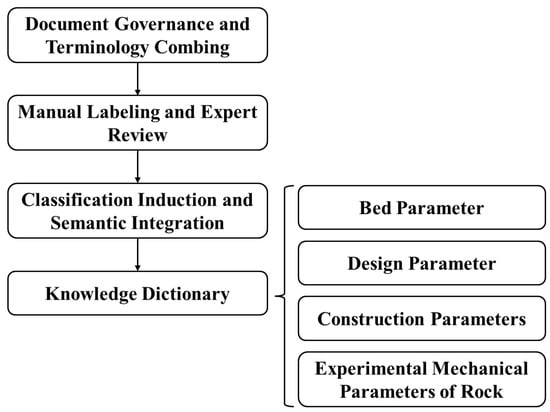 Initially, data governance is executed on an extensive array of fracturing documents to preliminarily identify core knowledge points. Secondly, the process of manual annotation and review by domain experts ensures the accuracy and completeness of the knowledge points. Thirdly, a hierarchically structured knowledge dictionary framework is formed through classification, summarization, and semantic integration, thereby addressing knowledge extraction needs at varying levels.