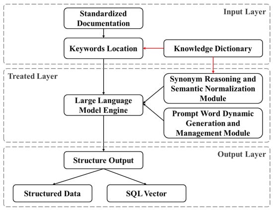 The knowledge extraction model designed in this study adopts a modular architecture based on a large language model (LLM), consisting of three main components: an input layer, a processing layer, and an output layer. These modules collaborate to achieve efficient extraction of structured knowledge from unstructured documents, as illustrated in Figure 5.
