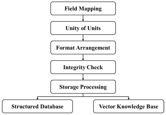 To support subsequent question-answering applications and ensure the standardization and usability of the extracted knowledge, we have designed a systematic normalization process for the extraction results, as shown in Figure 7. This process converts the unstructured information produced by the model into a format that can be stored directly, ultimately forming two core knowledge bases: a structured database and a vector knowledge base. Due to the challenges associated with deploying vector knowledge bases in engineering environments, the study primarily relies on the structured database to implement question-answering functionality, with the vector knowledge base providing supplementary support.