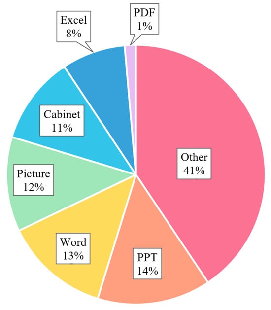 The data used in this study were derived from historical fracturing engineering documents from the Jimsar Basin from 2013 to 2025. These documents cover multiple aspects, including geological data, fracturing design, operational summaries, production monitoring, and rock mechanics. The documents are diverse and include Word, Excel, PDF, PowerPoint, image, compressed package, and other file types, exhibiting the typical characteristics of multi-source heterogeneity and complex formats. Figure 9 shows the specific file types and their distribution.