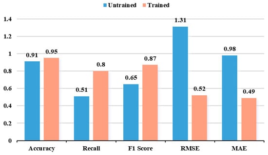 To further improve extraction performance, the model was trained and optimized using domain-specific corpora, followed by a systematic validation of the model outputs to confirm reliability and domain robustness. After training and optimization, the model achieved an extraction accuracy of 95%, a recall rate of 80%, and an F1 score of 87%. Both the root mean square error (RMSE) and mean absolute error (MAE) were maintained at low levels. Figure 11 illustrates a comparison of performance before and after training. These results demonstrate that this model configuration meets practical application requirements in terms of accuracy and stability.