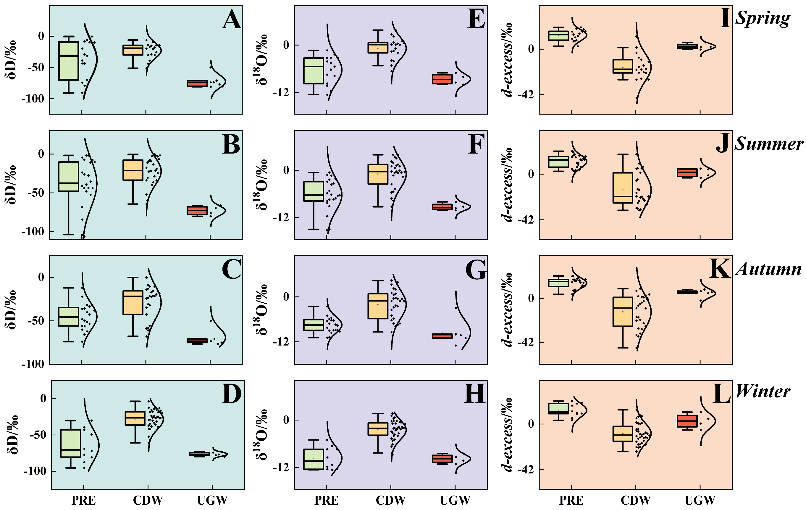 3.1. Seasonal Characteristics of Hydrogen and Oxygen Isotopes in Different Water