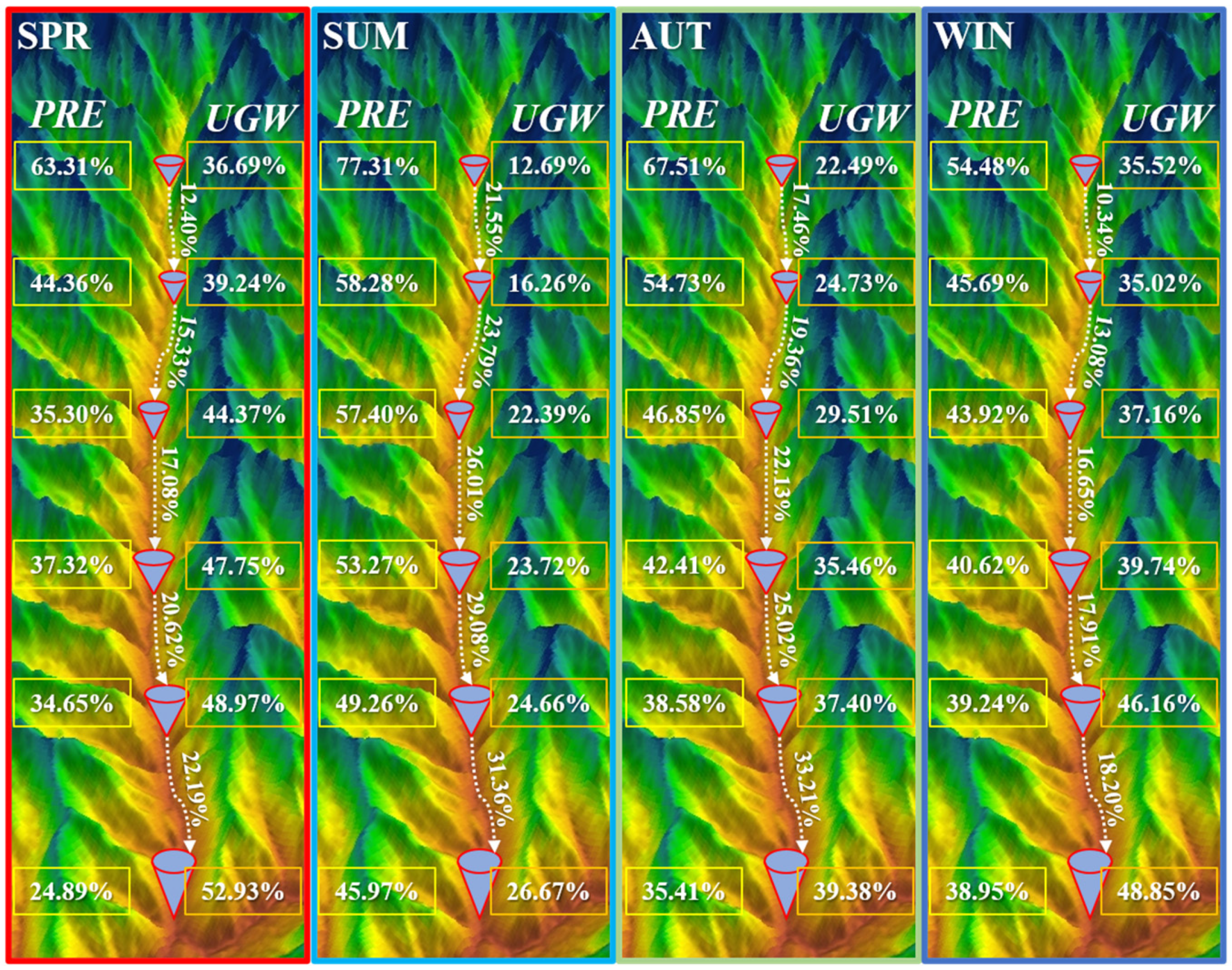 | Tributary | Seasons | PRE/% | UGW/% | Recharge Downward/% |
