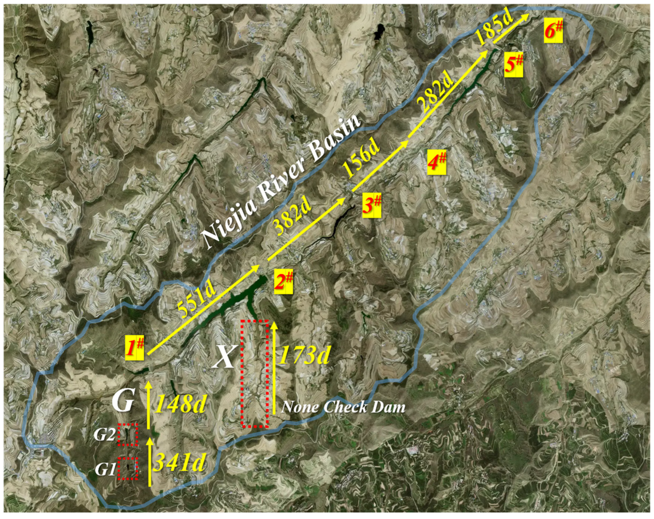 - Xue, S.; Li, P.; Cui, Z.; Li, Z. The influence of different check dam configurations on the downstream river topography and water–sediment relationship. J. Hydrol. 2025, 656, 133046. [Google Scholar] [CrossRef]