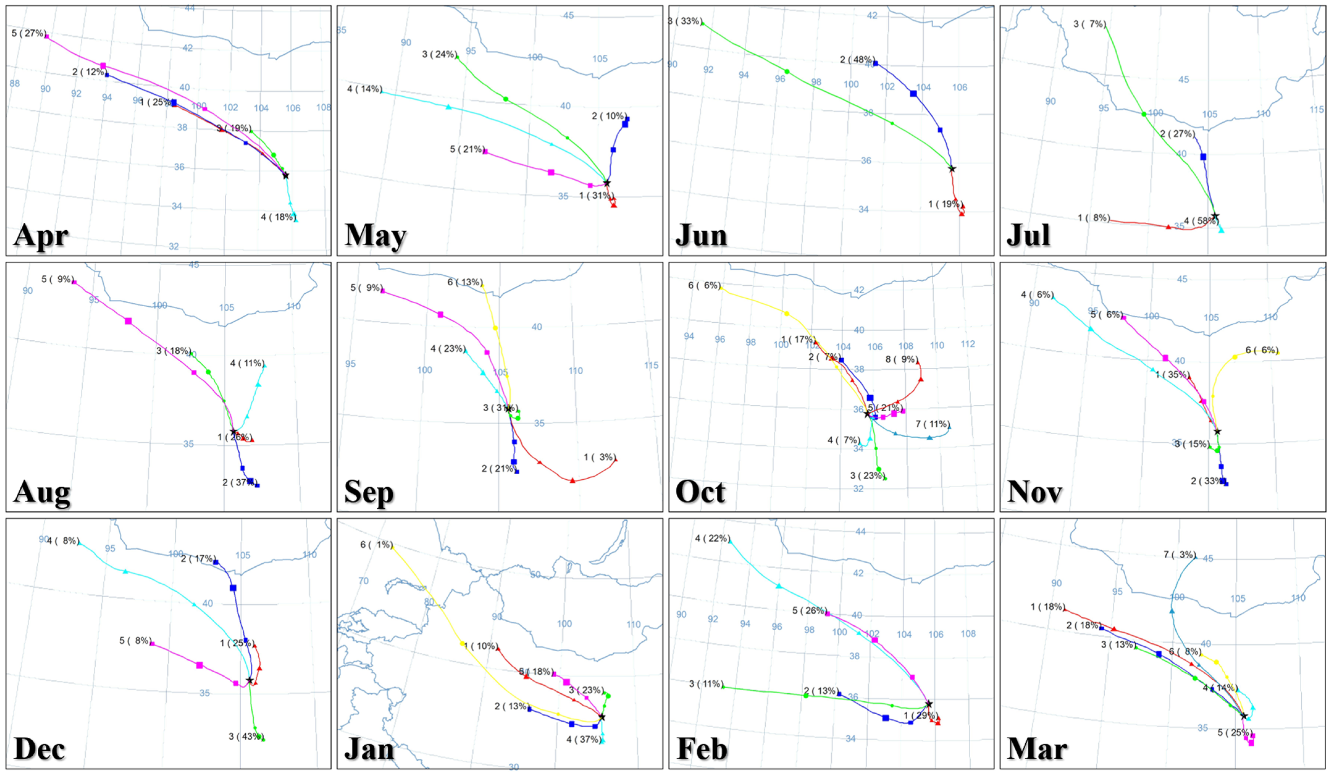 - Cui, L.; Song, X.; Zhong, G. Comparative analysis of three methods for HYSPLIT atmospheric trajectories clustering. Atmosphere 2021, 12, 698. [Google Scholar] [CrossRef]