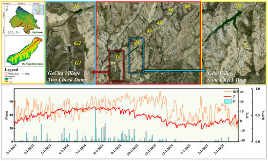 The study area is located in the Niejia small watershed of Xiji County, Ningxia (105°38′43″ E–105°41′00″ E, 35°47′02″ N–35°49′38″ N), which belongs to the Lanni River Basin, a tributary of the Hulu River. The total area of the watershed is 46.6 km2. The topography of the watershed is characterized by the Loess Hilly Region, and the soil erosion area is classified as the third sub-region of the Loess Plateau Hilly and Gully Region. The multi-year average precipitation in the watershed is 428.2 mm, and the total annual evaporation is 1490 mm, approximately 3.5 times the precipitation, indicating a strong evaporation effect. The cumulative precipitation in the watershed in 2024 was 418.10 mm. In the main channel of the Niejia River, six sediment retention dams (numbered 1#–6#) are built from west to east. For comparative research, two tributaries with similar area, channel length and watershed morphology were selected throughout the watershed. Among them, two sediment retention dams were built in tributary G, while no sediment retention dams were built in tributary X, which served as the control (Figure 1).