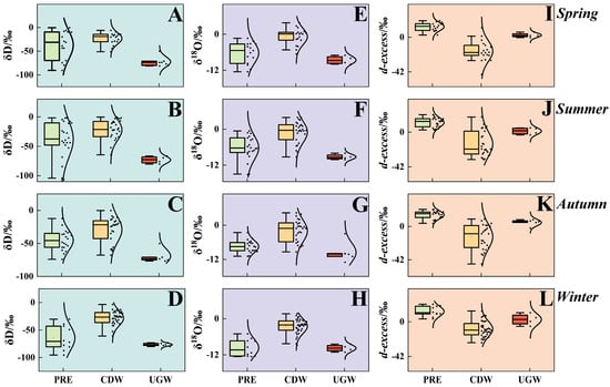 Seasonal characteristics of hydrogen and oxygen isotopes and d-excess values in precipitation (PRE), surface water (CDW) and groundwater (UGW) in the Niejia River Basin.