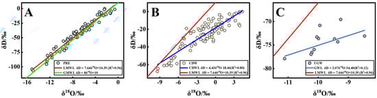 The least squares method was used to construct the linear regression equations of δD and δ18O for PRE, CDW and UGW, which were, respectively, defined as the local meteoric water line (LMWL), the surface water evaporation line (CDWL) and the groundwater evaporation line (GWL, Figure 3). The equation of LMWL is δD = 7.64δ18O + 10.39 (R2 = 0.96, Figure 3A), with a slope of 7.64. The equation of the global meteoric water line (GMWL) is δD = 8δ18O + 10, with a slope of 8. LMWL is located above and to the left of GMWL, with a slope smaller than that of GMWL and an intercept higher than that of GMWL. The equation of CDWL is δD = 4.43δ18O–18.46 (R2 = 0.88, Figure 3B), with both the slope and intercept smaller than those of GMWL and LMWL. The equation of GWL is δD = −2.07δ18O–54.4 (R2 = 0.12, Figure 3C), with both the slope and intercept much lower than those of GMWL and LMWL, and a relatively low coefficient of determination, indicating that the data points are more scattered.