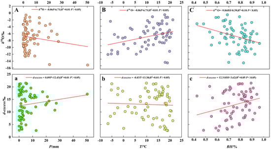 To explore the influence of local meteorological factors on the isotopic composition of precipitation, this study utilized linear regression to analyze the relationships between δ18O and d-excess values and precipitation (P), temperature (T), and relative humidity (RH) in the study area on an annual and seasonal scale (Figure 4). On an annual scale, δ18O showed no significant correlation with P and T (p > 0.05; Figure 4A,B), but was significantly negatively correlated with RH (p < 0.05; Figure 4C). The d-excess values had poor correlations with P and T (p > 0.05, Figure 4a,b), but were positively correlated with RH (p < 0.05, Figure 4c). In summary, on an annual scale, relative humidity (RH) is the main controlling factor for the isotopic composition of precipitation in the study area. On a seasonal scale, δ18O in spring was negatively correlated with T and RH (p < 0.05); in summer, δ18O was significantly negatively correlated with P (p < 0.01), and d-excess values were positively correlated with P (p < 0.05); in autumn, the slopes of the regression equations of δ18O with P, T, and RH were all negative, but the negative correlations were weak and not significant (p > 0.05); in winter, δ18O was correlated with P, T, and RH (p < 0.05, Table 1).