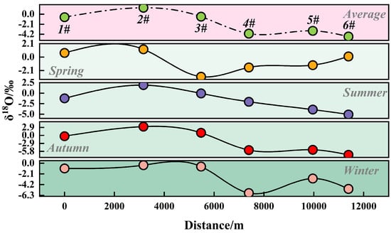 In CDW, the d-excess value shows a significant negative correlation with δ18O (d-excess = −3.52δ18O-18.51, R2 = 0.73, p < 0.01, Figure 5). In UGW, the d-excess value also shows a significant negative correlation with δ18O (d-excess = −5.93δ18O-54.40, R2 = 0.68, p < 0.01, Figure 6). The δ18O value of CDW along the main channel exhibits a fluctuation pattern of “increase, decrease, and then increase” throughout the year (Figure 7). This pattern exists in spring, autumn, and winter, while in summer it shows a pattern of “increase and then decrease”. Generally speaking, the heavy isotopes in the downstream CDW are more enriched than those in the upstream, and the two check dams at 2# and 4# are the key nodes for this trend change.