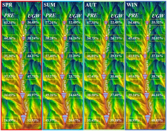 The recharge sources of the main channel check dam CDW exhibit distinct seasonal characteristics and elevation effects(Figure 8). The average proportions of recharge from PRE, UGW, and CDW along the course are 47.07%, 34.48%, and 20.64%, respectively. This indicates that the main channel check dam CDW mainly relies on the direct recharge from PRE, while the contribution of water exchange along the course from upstream (Dam 1#) to downstream (Dam 6#) is relatively limited. From the perspective of seasonal dynamics, the average recharge proportion of PRE reaches its peak in summer (56.92%) and drops to its lowest in winter (43.82%), with spring and autumn falling in between. The recharge proportion of UGW shows an opposite seasonal pattern, being highest in spring (44.94%) and lowest in summer (21.07%). The recharge proportion of CDW along the course is most significant in summer (26.36%) and lowest in winter (15.24%).