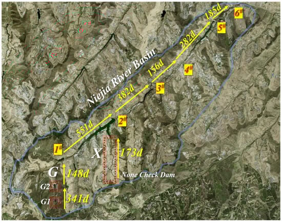 The complete transmission time of CDW between check dams shows significant spatial heterogeneity (Figure 9). In the main channel, the transmission time from 1# to 2# is the longest (551 d), while that from 3# to 4# is the shortest (156 d). More importantly, in the dammed tributary G, the overall complete transmission time of CDW from Dam G1 through Dam G2 to the main channel is 489 d; in sharp contrast, the transmission time of CDW from the undammed tributary X to the main channel only takes 173 d.