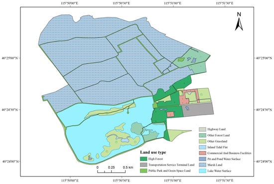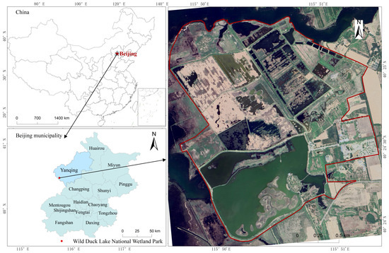 Wild Duck Lake National Wetland Park (40°23′58″–40°25′25″ N, 115°49′41″–115°51′23″ E) is located in the southwestern Yanqing District, Beijing (Figure 1), at the foot of the Badaling Great Wall and on the shores of the Guanting Reservoir. It boasts the largest and most biodiverse near-natural wetland ecosystem in North China. Officially opened to the public in 2013, the park covers approximately 418.9 ha and has a warm temperate semi-arid, semi-humid continental monsoon climate with distinct four seasons: dry, cold, and windy winters and rainy, hot, and humid summers. The average annual temperature is 8.7 °C, the frost-free period averages 182.2 days, and the average annual sunshine hours are 2727.3 h. The average annual precipitation is 441.8 mm, with an average of 68 rainy days. The park has 392 recorded species of higher plants, and bird species increased to 361 in 2022, representing 24.3% of the national bird species count. It serves as a crucial stopover for migratory birds along the East Asian-Australasian Flyway [41]. Wild Duck Lake National Wetland Park welcomes over 200,000 visitors annually, balancing its value as a research and educational institution with ecotourism. Furthermore, in 2023, on the 27th World Wetlands Day, Wild Duck Lake Wetland was successfully listed on the List of Wetlands of International Importance, becoming the first and only wetland in Beijing to receive this distinction, confirming its importance as a wetland of international importance.
