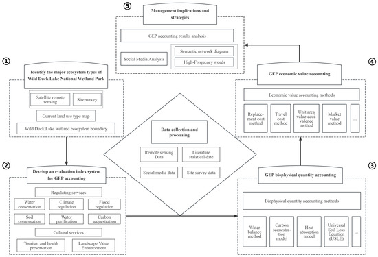 Based on data collection and preprocessing, this study explored five key research components: defining ecosystem types, compiling a GEP inventory, conducting biophysical and economic value accounting, and exploring value enhancement strategies (Figure 2). The first component involves a site survey of land use in the study area to identify wetland ecosystem types, structure, and ecological processes. The second focuses on developing an assessment index system for GEP accounting, selecting representative accounting indicators to ensure they capture the key ecological and socio-economic benefits generated by the park’s ecosystem. The third and fourth sections focus on biophysical and economic value accounting, integrating the latest advancements in global wetland ecosystem service valuation and referring to both national and local standards. The biophysical accounting is conducted using methods such as the water balance approach, while the economic value accounting is carried out using methods such as the market value method. The fifth component compares and validates the valuation results with representative wetland valuation cases. This analysis, combined with high-frequency words and semantic network diagrams from social media data, provides recommendations and guidance for enhancing the value of Wild Duck Lake National Wetland Park.