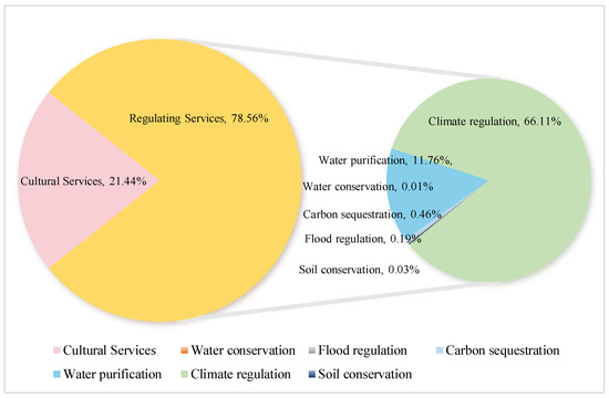 In 2023, the total GEP value of the park’s wetland ecosystem was estimated at 155.01 million CNY, equivalent to 35.47 million CNY per square kilometer. Among the various ecosystem service categories, climate regulation contributed the most to the total value, followed by tourism and health preservation, water purification, carbon sequestration, landscape value enhancement, flood regulation and storage, soil conservation, and water conservation. These findings highlight the substantial ecological and cultural economic value of the park, particularly its regulatory functions that play a vital role in maintaining regional water quality and environmental security.