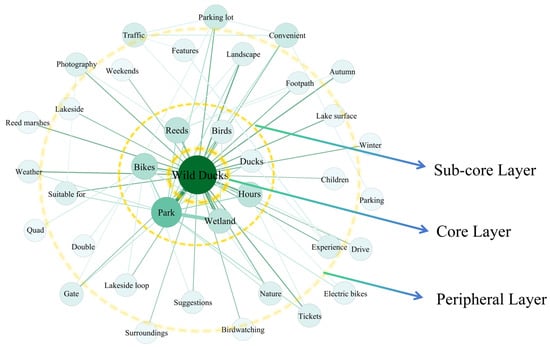 The social semantic network analysis results show that tourists’ perception presents a “multi-core-edge” structure. By constructing a three-tiered structure, visitors’ perceptions of the Wild Duck Lake Wetland Ecosystem’s cultural services are comprehensively presented [66]. Among the core words identified in the social semantic network, “wild duck,” “wetland,” and “park” appear most frequently. The three keywords in the name of Wild Duck Lake National Wetland Park are all core words, indicating that tourists’ forward gaze is guided by this social construction, thus forming an induced image. After entering the park, tourists will unconsciously look for one or several focus points and ignore unattractive elements. In the middle circle, there are many words about photography, scenery, and internal play methods, indicating that tourists focus on their own play experience. In the outermost circle, words such as “weekend”, “children” and “driving” reflect tourists’ travel motivation and travel methods. “Transportation” is linked with “convenience”, indicating that the park has good accessibility. Visitors are highly satisfied with the park environment but are also aware of the conflict between ecological protection and tourism development. Our field visit and the negative comments from tourists about the winter scenery of Wild Duck Lake also confirm this view.