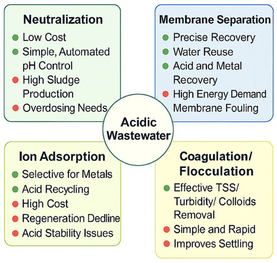 Chemical neutralization, membrane-based processes, and other physicochemical techniques have been developed to manage acidic wastewater [12,13]. The benefits and limitations of each acidic wastewater treatment technology are summarized in Figure 2. Recent reviews have addressed broad aspects of acidic, metal-rich wastewaters; for instance, Juve et al. [14] reviewed electrodialysis for metal removal, and Du et al. [15] and Nguegang et al. [16] summarized sustainable treatment strategies for acid mine drainage. However, there remains a conspicuous gap, where few studies focus specifically on the acidic wastewater generated by electrode foil manufacturing, which combines ultra-low pH (pH < 3), high dissolved metal burdens (Al, Cu, Zn), elevated chloride/sulfate loads, and the dual challenge of both pollutant treatment and resource recovery. In this context, this review makes three novel contributions. Firstly, it defines this challenging industrial stream as a discrete treatment target. Secondly, it maps major technology families (neutralization/precipitation, ion adsorption/ion exchange, membrane separation, and coagulation/flocculation) into a single process train tailored to that stream. Thirdly, it adopts a resource recovery and circular economy framework, emphasizing acid/metal recovery, low-carbon design, digital process control, and techno-economic/environmental metrics. Furthermore, this review hopes to provide engineers and researchers with a sector-specific, system-level roadmap rather than technology-by-technology summaries alone.
