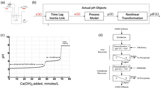 (a) pH neutralization reaction schematic. (b) Object structure diagram. u(k)—output of time lag inertia link. [25]. (c) pH curve for lime precipitation removal of Fe and Al ions in acidic wastewater [28]. (d) Flow sheet of precipitation removal of Fe and Al ions in acidic wastewater [29], * pH range determined by Fe and Al precipitation processes presented in subsequent section.