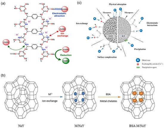 (a) Schematic diagram of CTF and adsorption capacity [45]. (b) Schematic diagram of the removal of heavy metal ions and BSA by NaY zeolite [46]. (c) Schematic representation of the possible adsorption mechanisms [50].