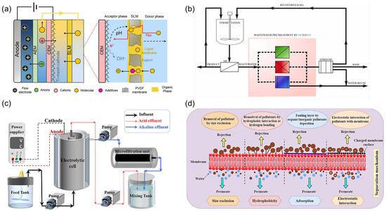 Schematic diagram of (a) improved FCDI system integrated with SLM [76]. (b) Process design and the experimental set-up for three technologies tested in this research (in the pink box). MF—microfiltration; NF—nanofiltration; IER—ion exchange resin; ED—electrodialysis with standard AEM and mCEM [82]. (c) Combined electrolytic cell–microfiltration system for P recovery [83]. (d) Membrane filtration and its separation mechanism [85].