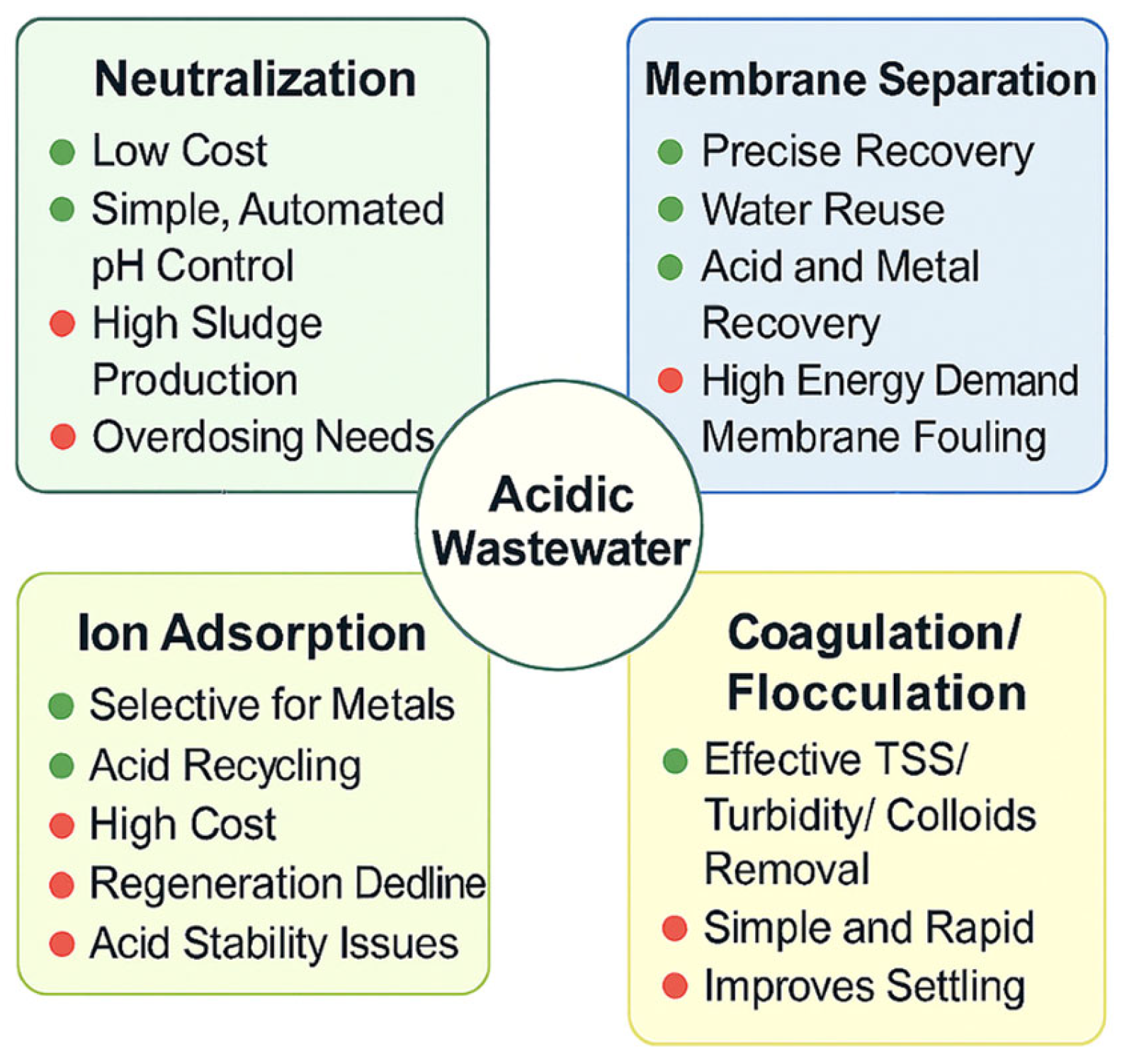 | Neutralization (alkali addition + precipitation) | Rapid pH control and bulk removal of dissolved metals; low reagent cost (lime, carbide slag); simple and mature process for large-scale operation. | High sludge yield and disposal cost; residual metals and hardness in effluent; reagent overdosing (1.2–1.5 × theoretical). | Optimizing pH setpoints for multi-metal systems; sludge dewatering and valorization; maintaining efficiency at high sulfate/chloride load. | AI-based dosing and process control; resource recovery from Al(OH)3 to α-Al2O3; integration with electrochemical or membrane polishing. | Zhao et al. [20]; Qasem et al. [21]; Du et al. [15] |
