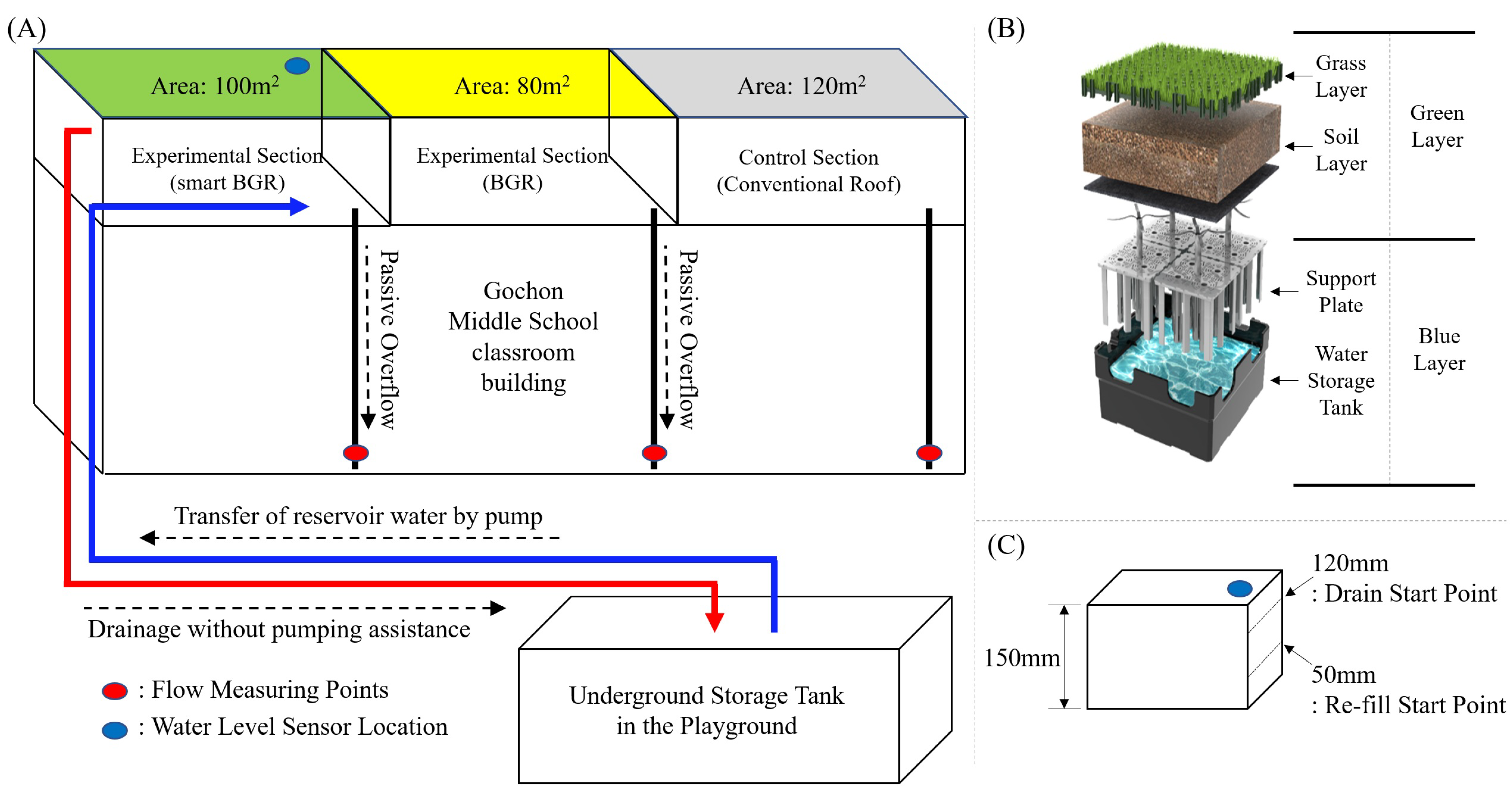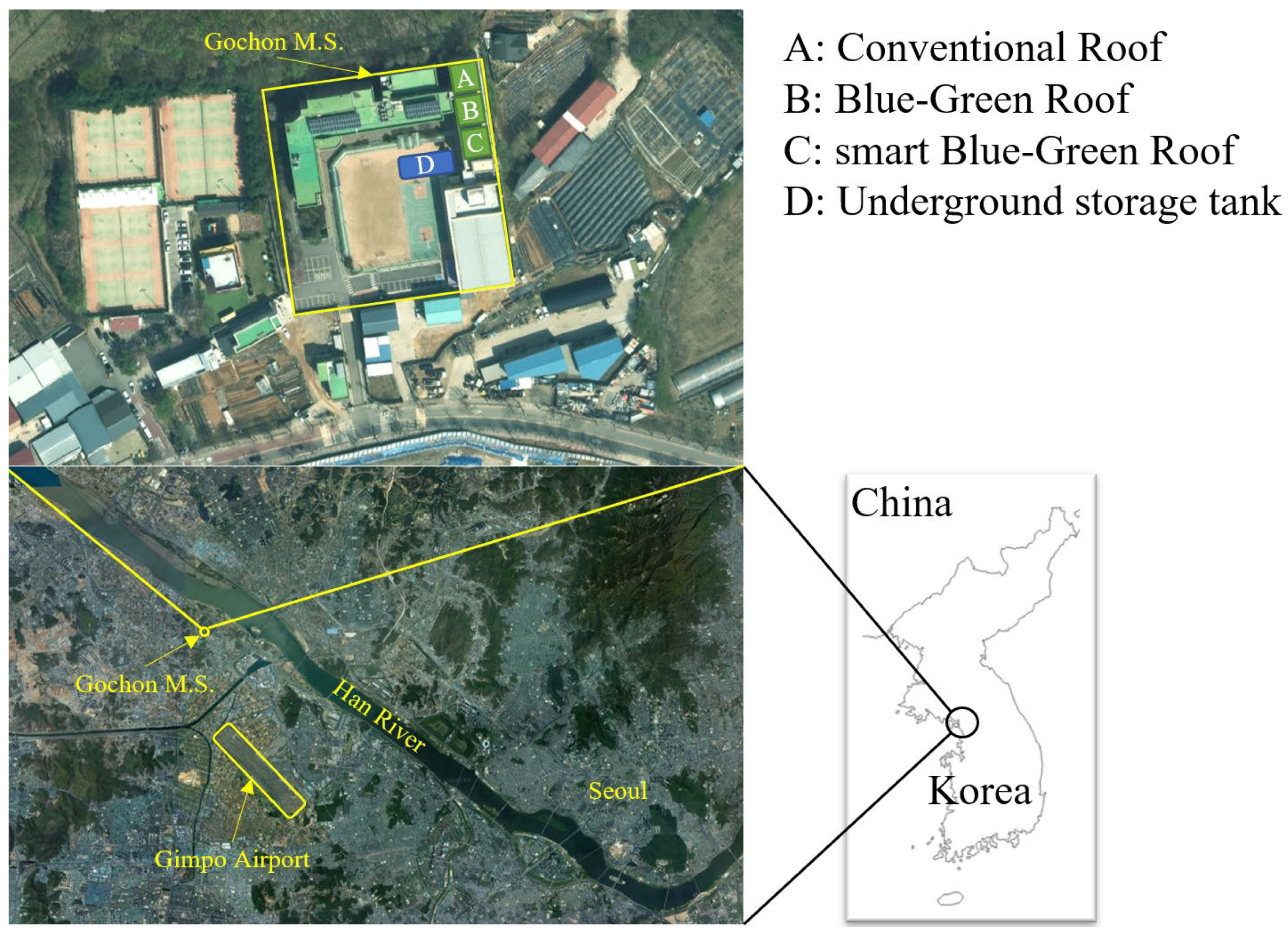The demonstration site for the BGR system is located at Gochon Middle School in Gimpo-si, Gyeonggi-do, South Korea, approximately 3 km north of Gimpo Airport and near the Han River. The geographical location and spatial configuration of the experimental roofs and underground storage tank are illustrated in Figure 1. As shown in the figure, three rooftop sections were designated for experimental comparison: the conventional roof (A), the BGR (B), and the smart BGR (C). An 80-ton corrugated-resin underground storage tank (D) was installed beneath the school playground and hydraulically connected to each rooftop section. The BGR and smart BGR systems were installed on the rooftop of one of the classroom buildings to evaluate their hydrological performance under real-world rainfall conditions. The underground tank temporarily stores excess rooftop runoff and supplies irrigation water during dry periods, forming a closed-loop configuration that supports efficient water-quality management and represents a practical retrofit design for existing buildings.