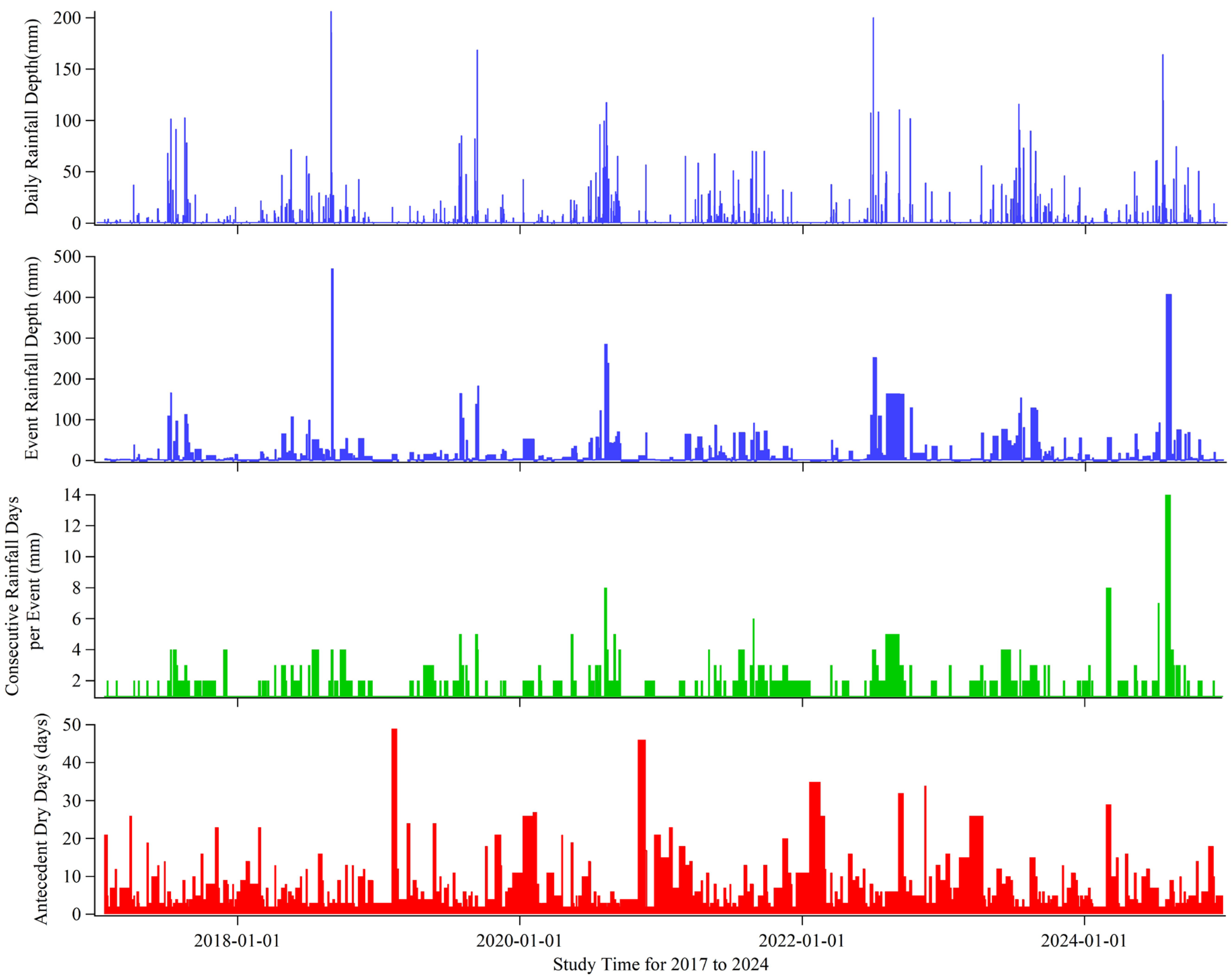 Precipitation data were simultaneously collected from an automated weather station located within 1 km of the study site. For consistency and accuracy in hydrological analysis, individual rainfall events were identified and classified based on temporal separation criteria. Specifically, when more than 24 h elapsed without rainfall between events, a new event was defined. In cases of consecutive rainy days, these were treated as a single rainfall event to account for cumulative hydrological responses. Runoff volumes were computed for each distinct rainfall event, and data anomalies caused by sensor malfunction or missing rainfall records were excluded through a quality control process.