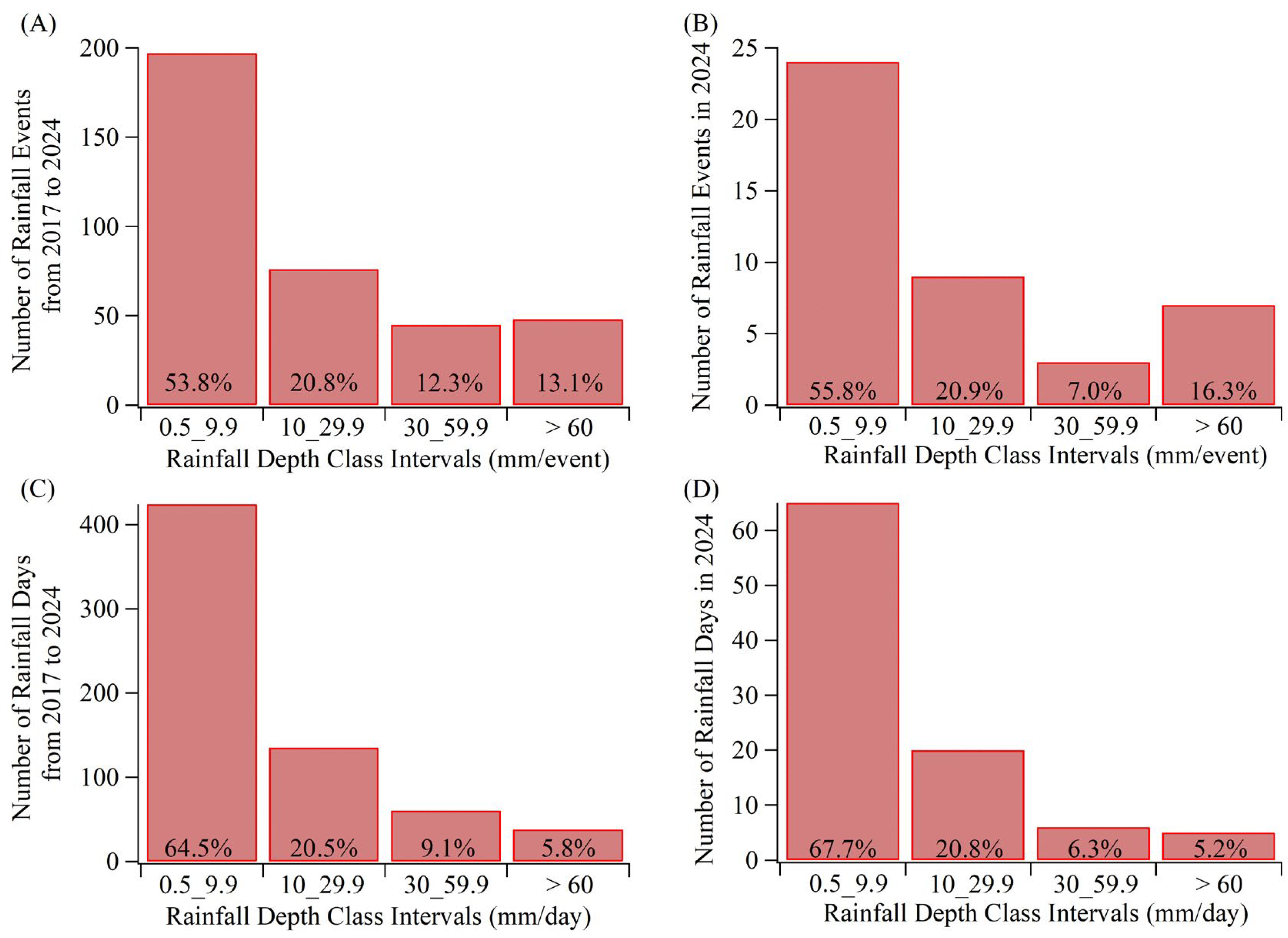 Distribution of rainfall depth class intervals in the Gimpo area: (A) Number of rainfall events from 2017 to 2024, (B) Number of rainfall events in 2024, (C) Number of rainfall days from 2017 to 2024, and (D) Number of rainfall days in 2024.