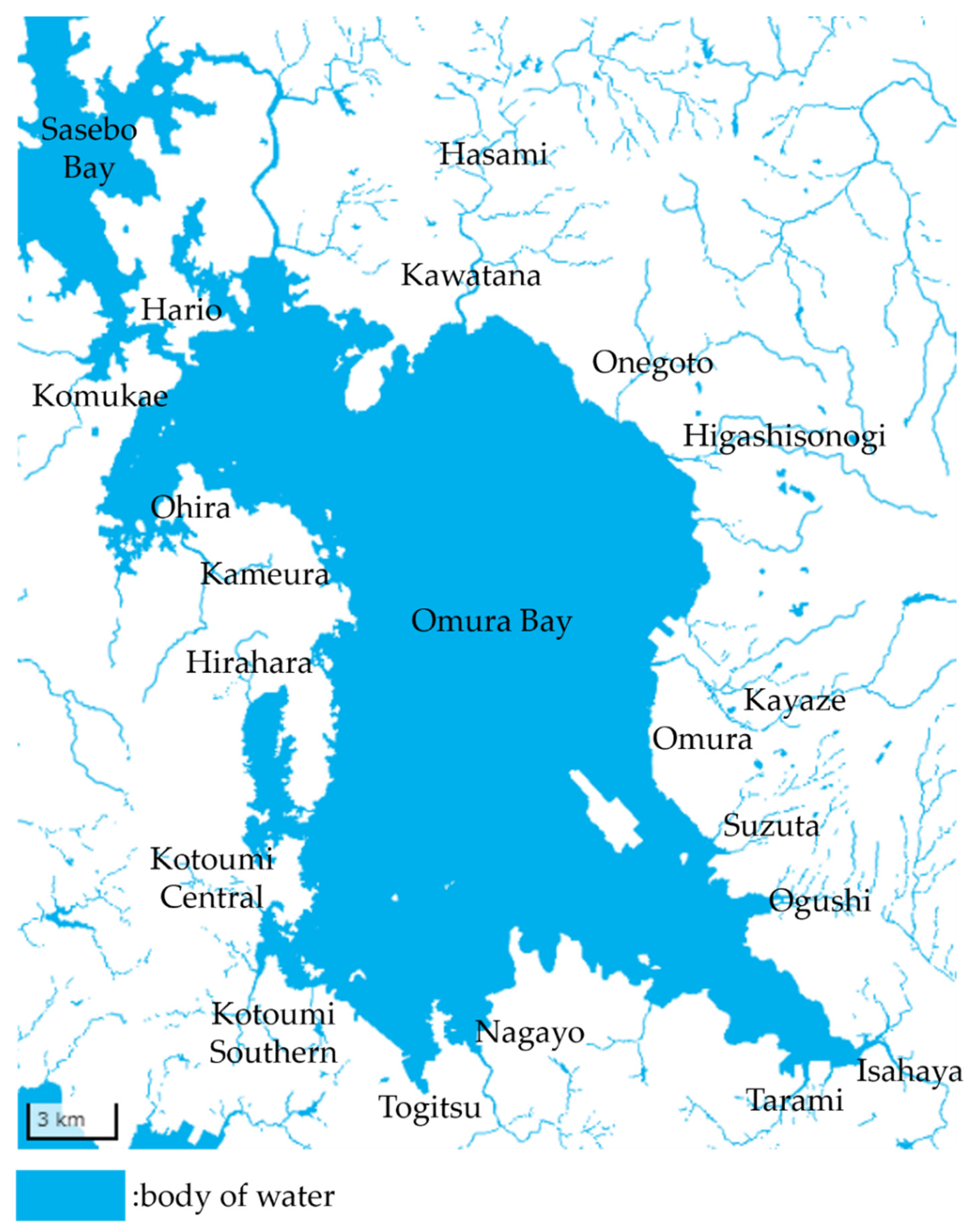 12], justifying its selection as the focus of this study. In Omura Bay, eutrophication is progressing in some locations while oligotrophication is advancing in others. Consequently, there is a concern that total load control across the entire bay could negatively impact the fishery industry. The “Satoumi” approach may be effective in such a situation.