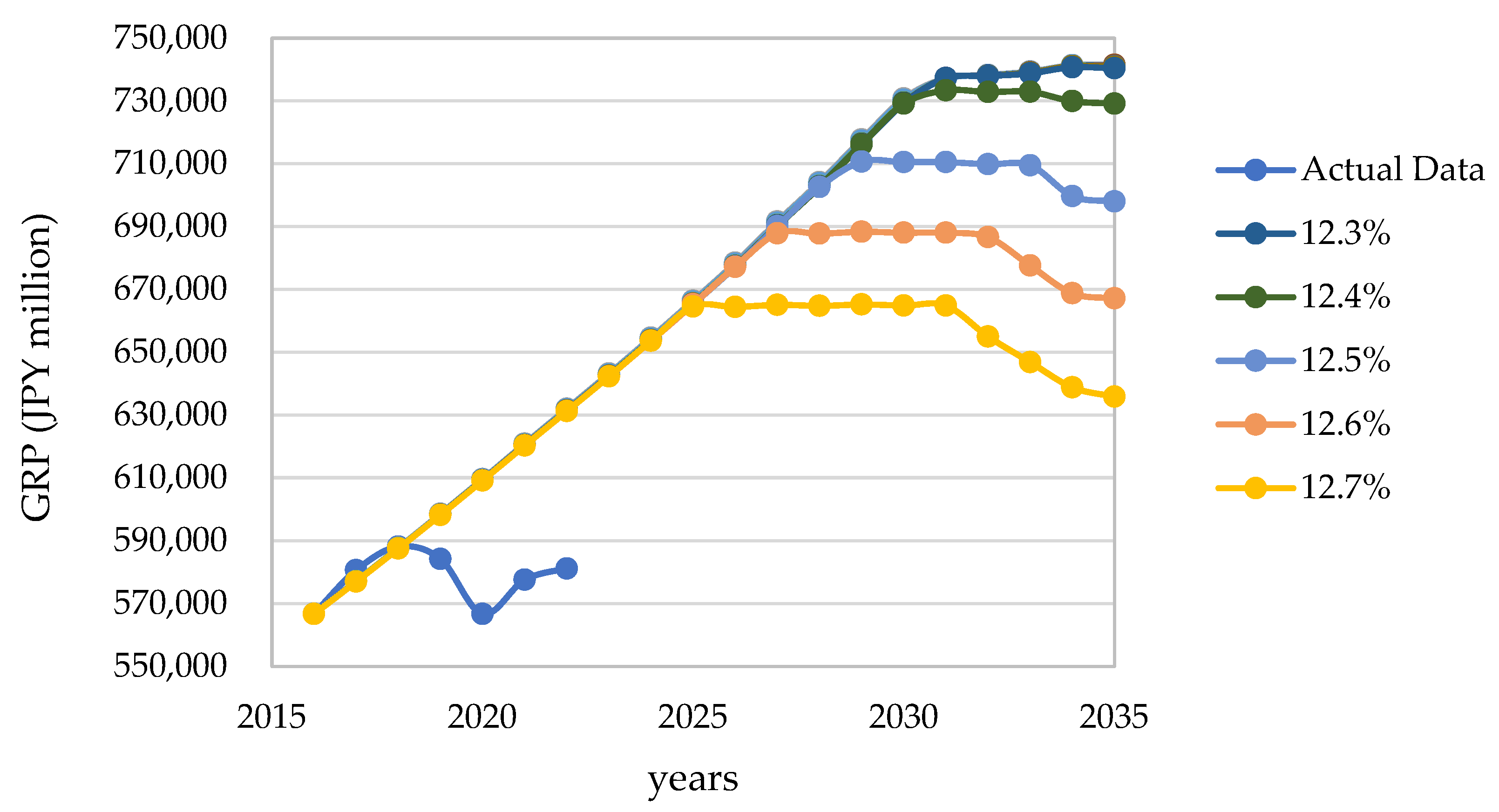 Figure 9 shows the differences in GRP when inflow is managed, the current conditions are maintained, and the total amount is reduced. The final GRP in 2035 under the inflow management scenario was JPY 7.360 trillion. This value is approximately JPY 5.5 billion lower compared with the 0% reduction case, where current conditions were maintained, and approximately JPY 4.5 billion lower compared with the 12.3% reduction case, where the maximum possible reduction was achieved without significantly decreasing GRP. However, this value is also approximately JPY 100 billion higher compared with the 12.7% reduction case, in which maximum reductions are the goal. As the decrease compared to that under the situation maintaining the current conditions was only about 0.8%, the policy of managing inflow had little impact on the GRP.