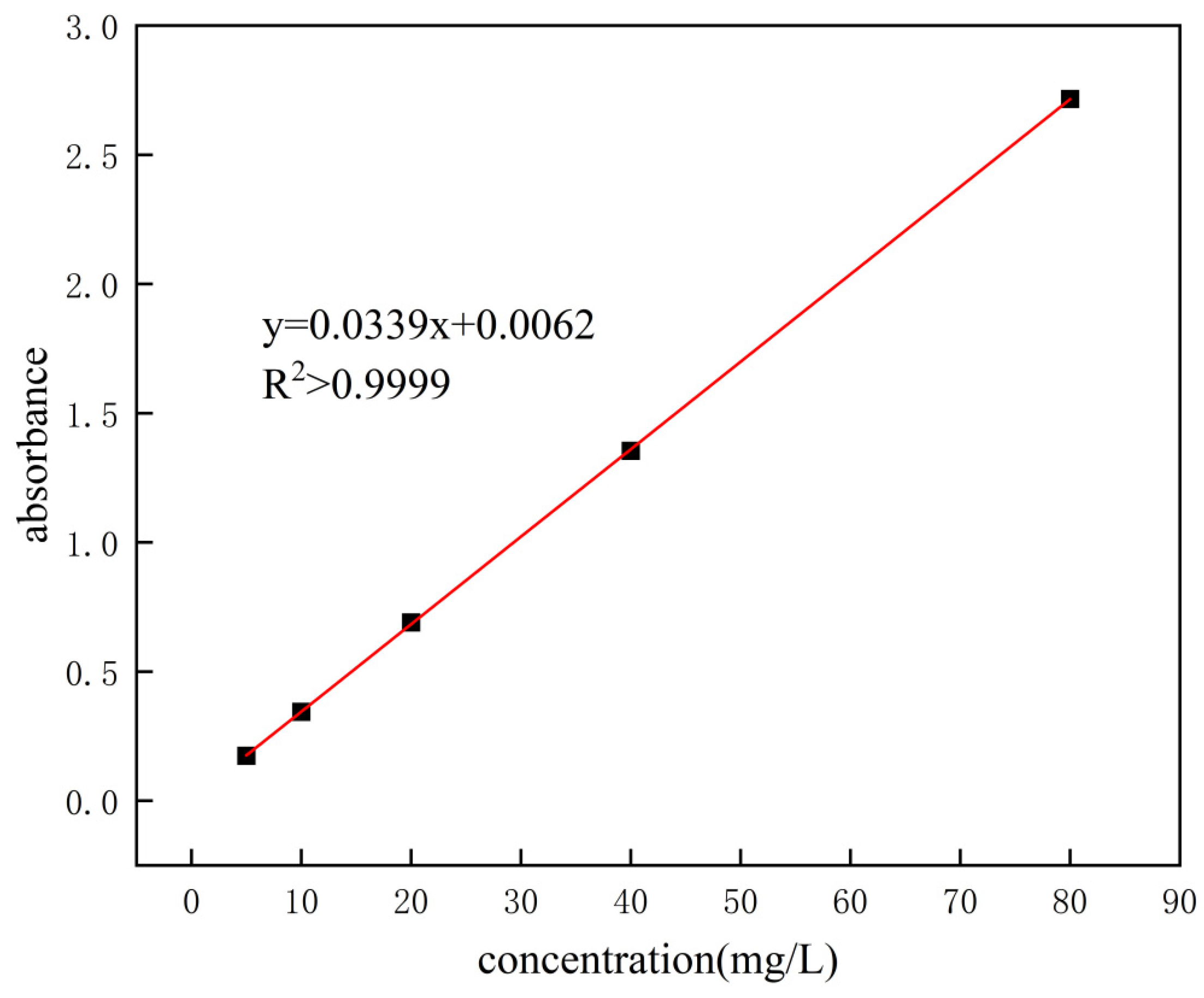 Adsorption experiments were performed to evaluate the TCH adsorption performance of the biochar synthesized under the optimal modification conditions. A stock TCH solution with a concentration of 1000 mg·L−1 was initially prepared and subsequently diluted to the desired concentrations. A 50 mL aliquot of the working solution was used for each adsorption test. The effects of multiple variables, including pH, adsorbent dosage, contact time, initial TCH concentration, and temperature, on the adsorption efficiency were systematically investigated. The dosage of modified biochar was varied between 2 and 50 mg. The pH was precisely adjusted within a range of 3 to 10 using 0.1 mol·L−1 HCl and NaOH solutions. The contact time was set from 5 to 2880 min, while the initial TCH concentration ranged from 10 to 100 mg·L−1. All experiments were conducted at temperatures varying from 15 to 35 °C. The adsorbent’s resistance to cationic interference was further investigated under the predetermined optimal adsorption conditions. Upon completion of adsorption, solid–liquid separation was achieved using a 0.45 µm membrane filter. The residual tetracycline hydrochloride (TCH) concentration in the filtrate was quantified at 357 nm via UV-Vis spectrophotometry (SPECORD 50 PLUS, Analytik Jena (Beijing) Instrument Co., Ltd., Beijing, China). A calibration curve (Figure 2) was established by measuring the absorbance of a series of standard TCH solutions, correlating absorbance with known concentrations. The concentration of TCH in unknown samples was subsequently determined by applying their measured absorbance to the regression equation of this calibration curve.