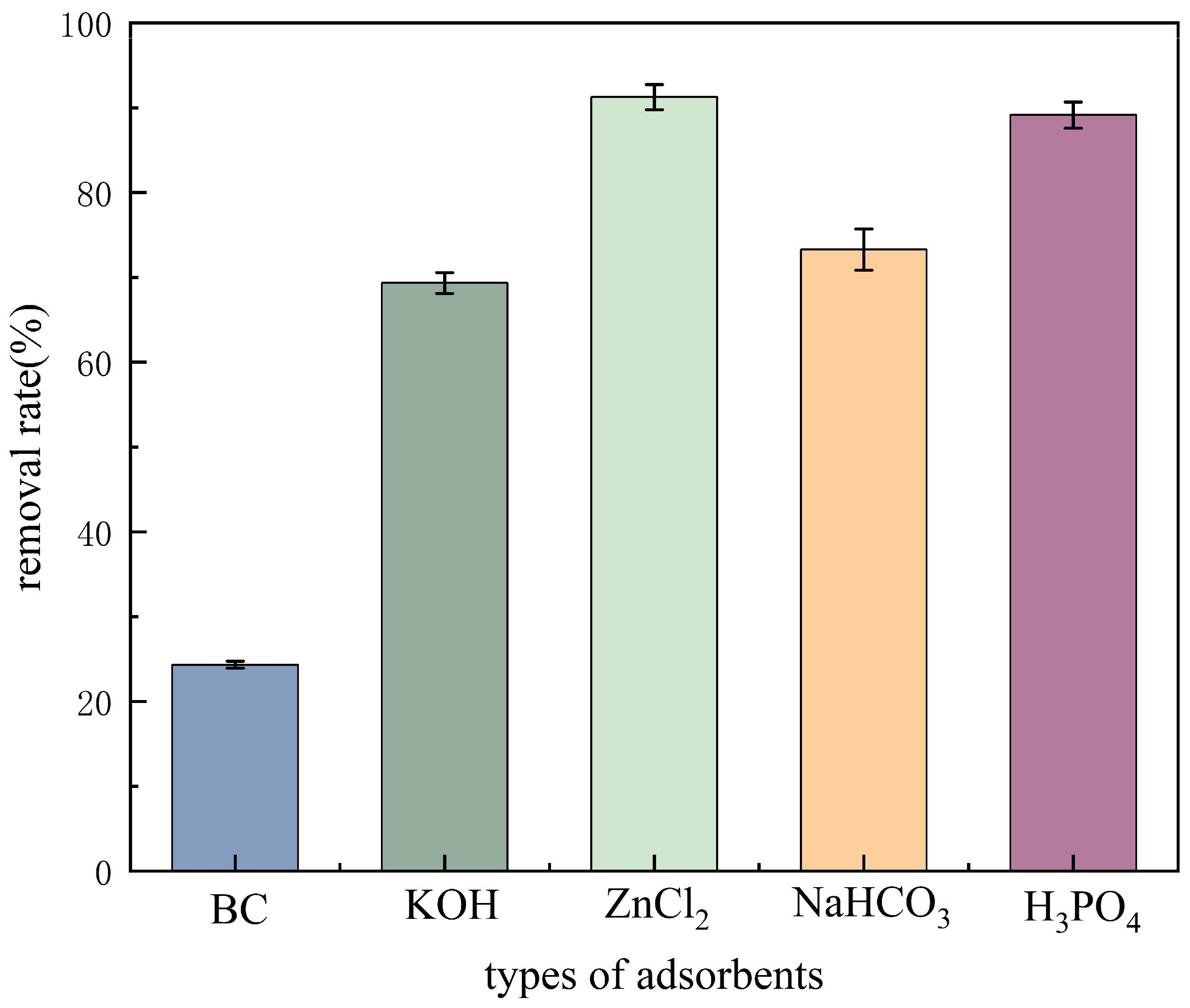 Figure 3 illustrates the comparative performance of biochars modified with 2 mol·L−1 KOH, H3PO4, NaHCO3, and ZnCl2 in terms of TCH removal efficiency under identical conditions. The results indicate that all four modified biochars demonstrate markedly superior TCH removal rates compared to the unmodified biochar (BC) [16,17]. Among them, the KOH- and NaHCO3-modified biochars achieved TCH removal rates that were 2.85 and 3.01 times those of BC, respectively. In contrast, the ZnCl2 and H3PO4 modifications proved more effective, exhibiting removal rates 3.75 and 3.66 times higher than that of BC, respectively.