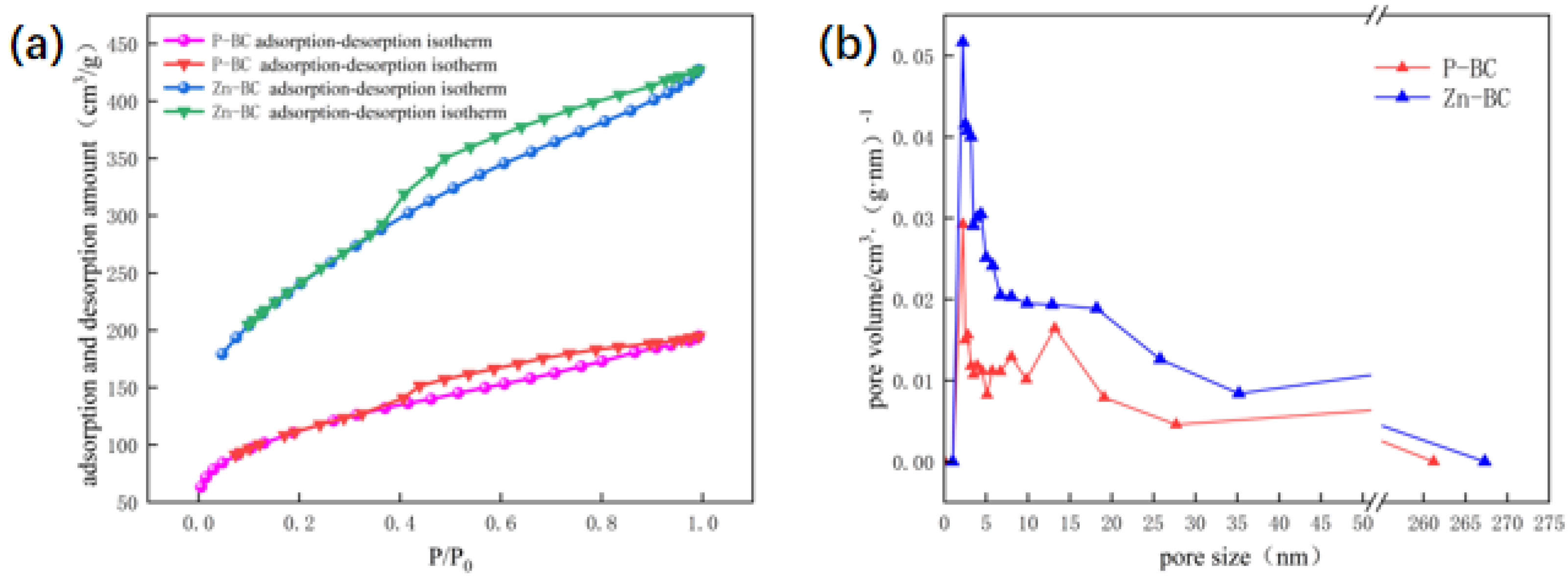 Figure 6. N2 adsorption–desorption isotherms and pore size distribution curves of Zn-BC and P-BC ((a) Adsorption–desorption isotherms, (b) Pore size distribution).