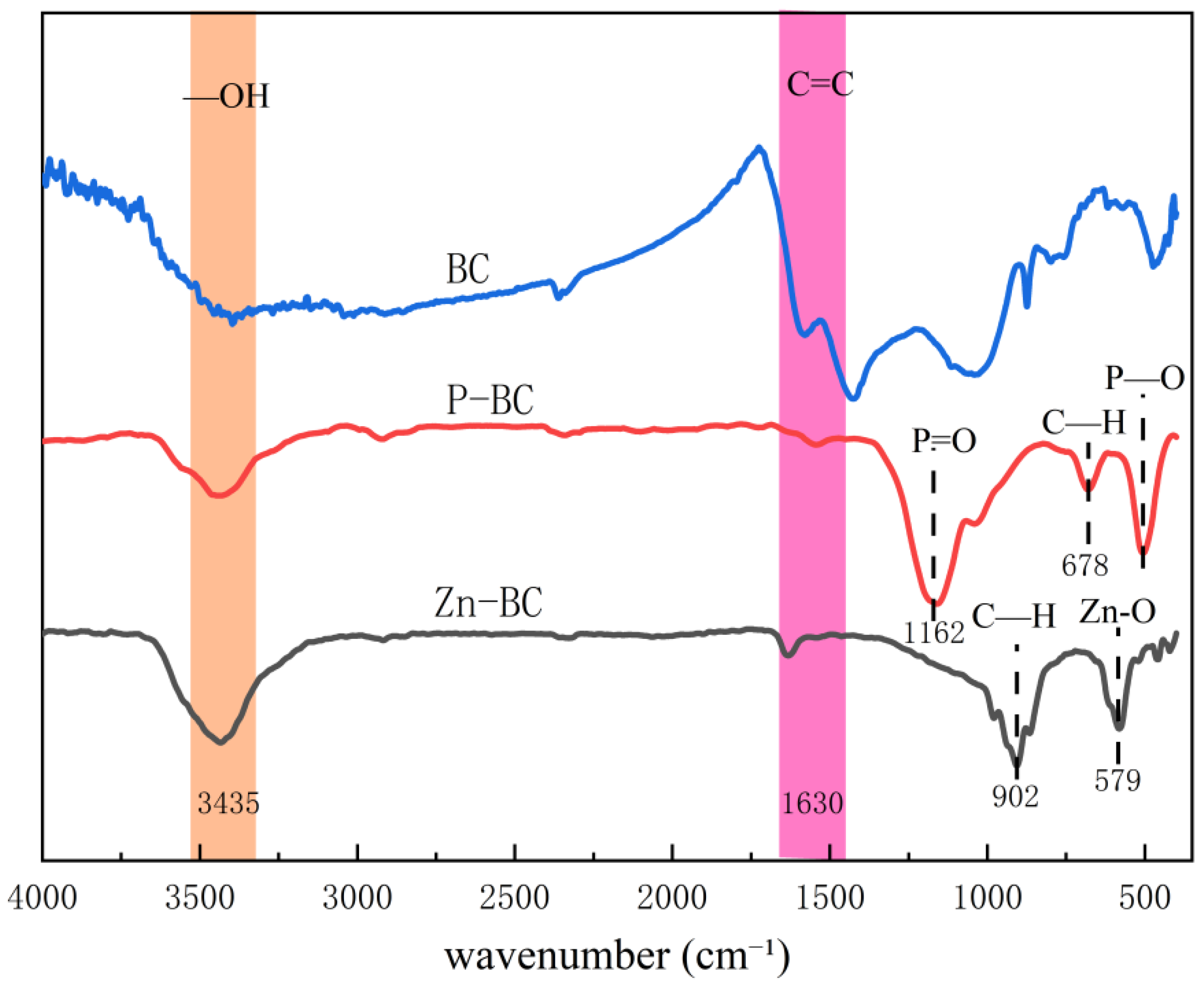 Figure 7. FTIR spectra of unmodified biochar (BC), phosphoric acid-modified biochar (P-BC), and zinc chloride-modified biochar (Zn-BC).